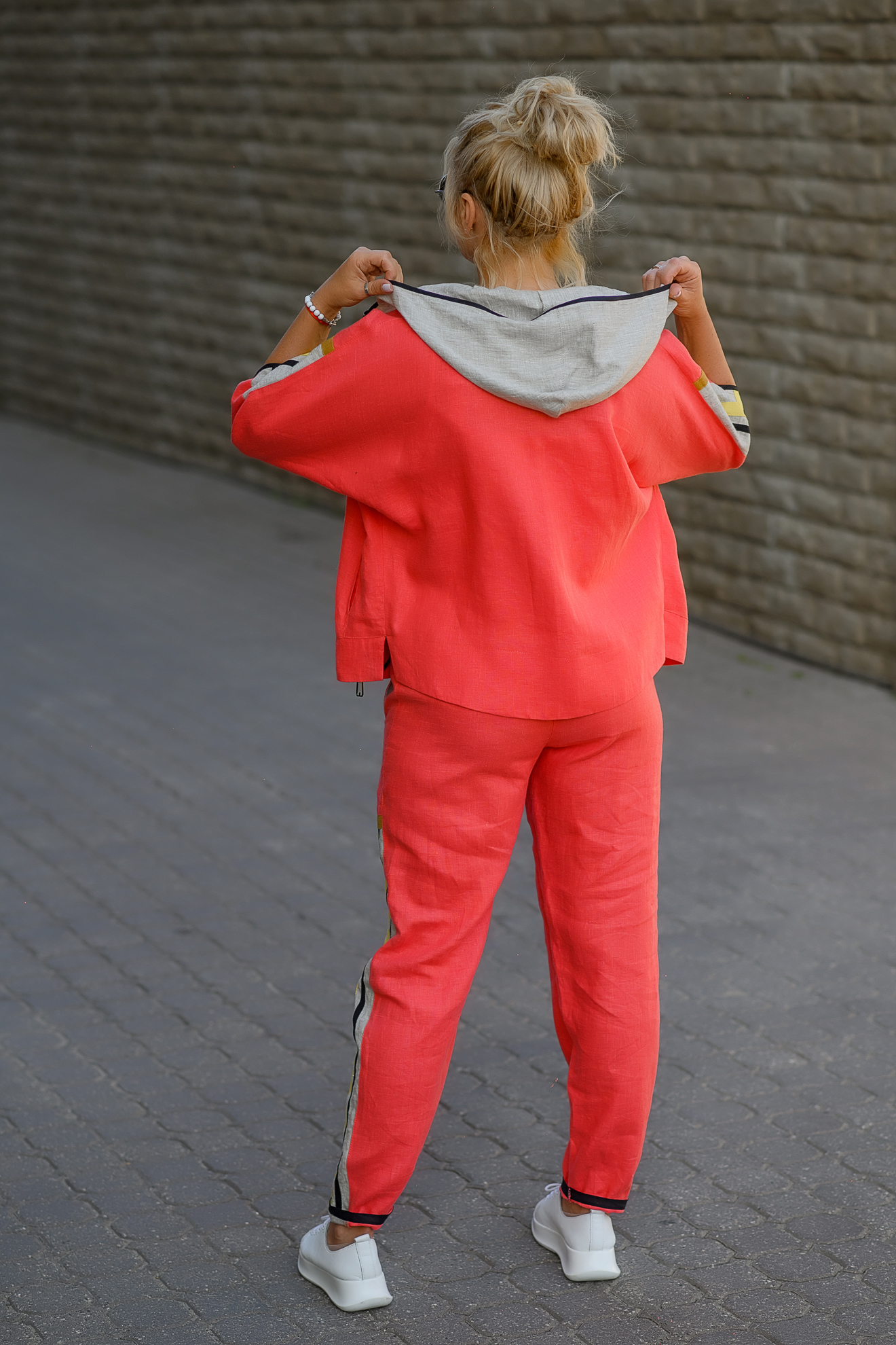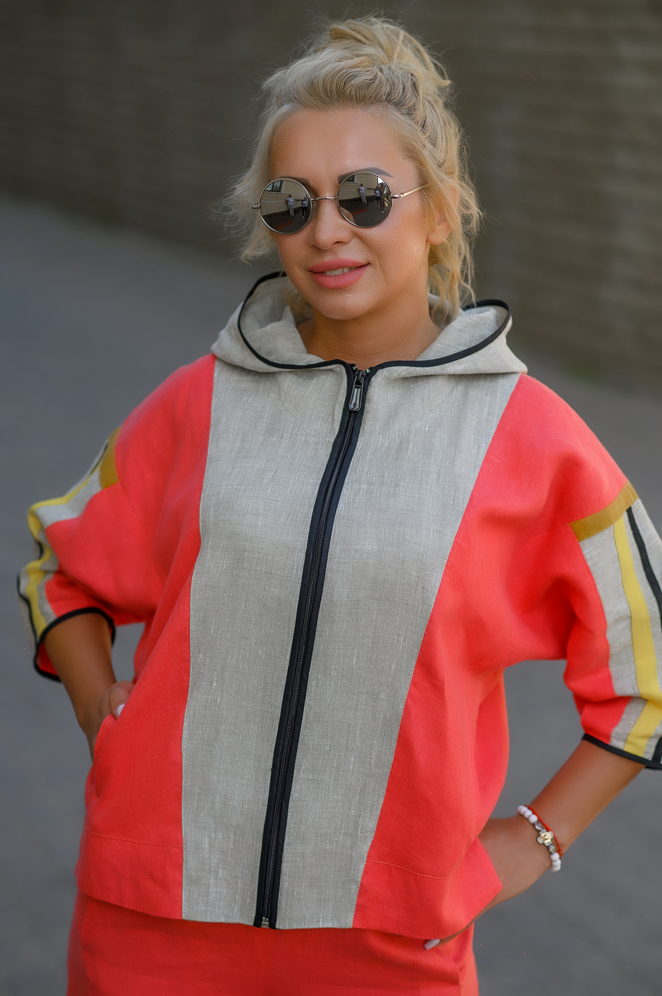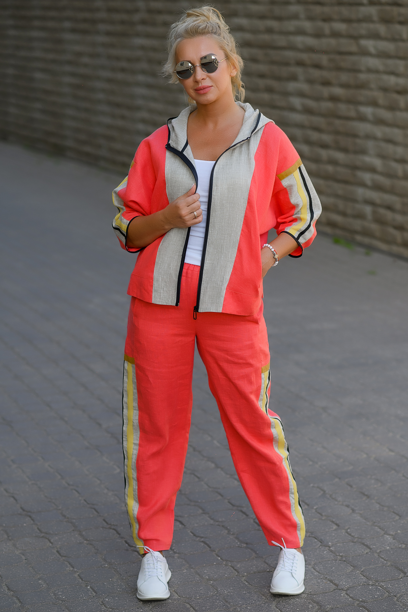 Льняная женская куртка спортивного стиля. Оригинальна в сочетании с тканями других цветов. Имеет 2 боковых кармана, застежка на молнию, рукав ¾. Рекомендована в комплекте с брюками арт. 049, как единый костюм. Стиль «оверсайз», размеры совмещены.