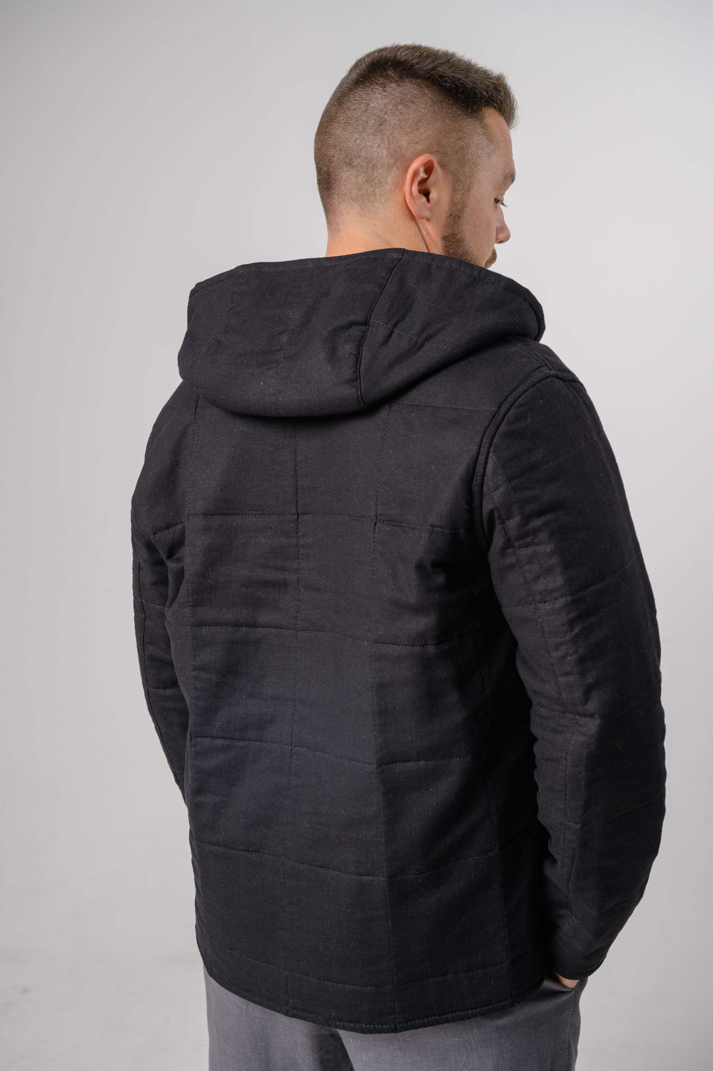 Мужская льняная классическая куртка с капюшоном на натуральном утеплителе (100% хлопок). Застежка на навесные петли и пуговицы. Изделие выстегано, подкладка куртки выполнена из натурального хлопка. Низ рукава возможно подворачивать в виде манжета. Имеются 2 накладных кармана. Вещь легка в эксплуатации, стирается в домашних условиях, не требует дополнительных средств ухода.