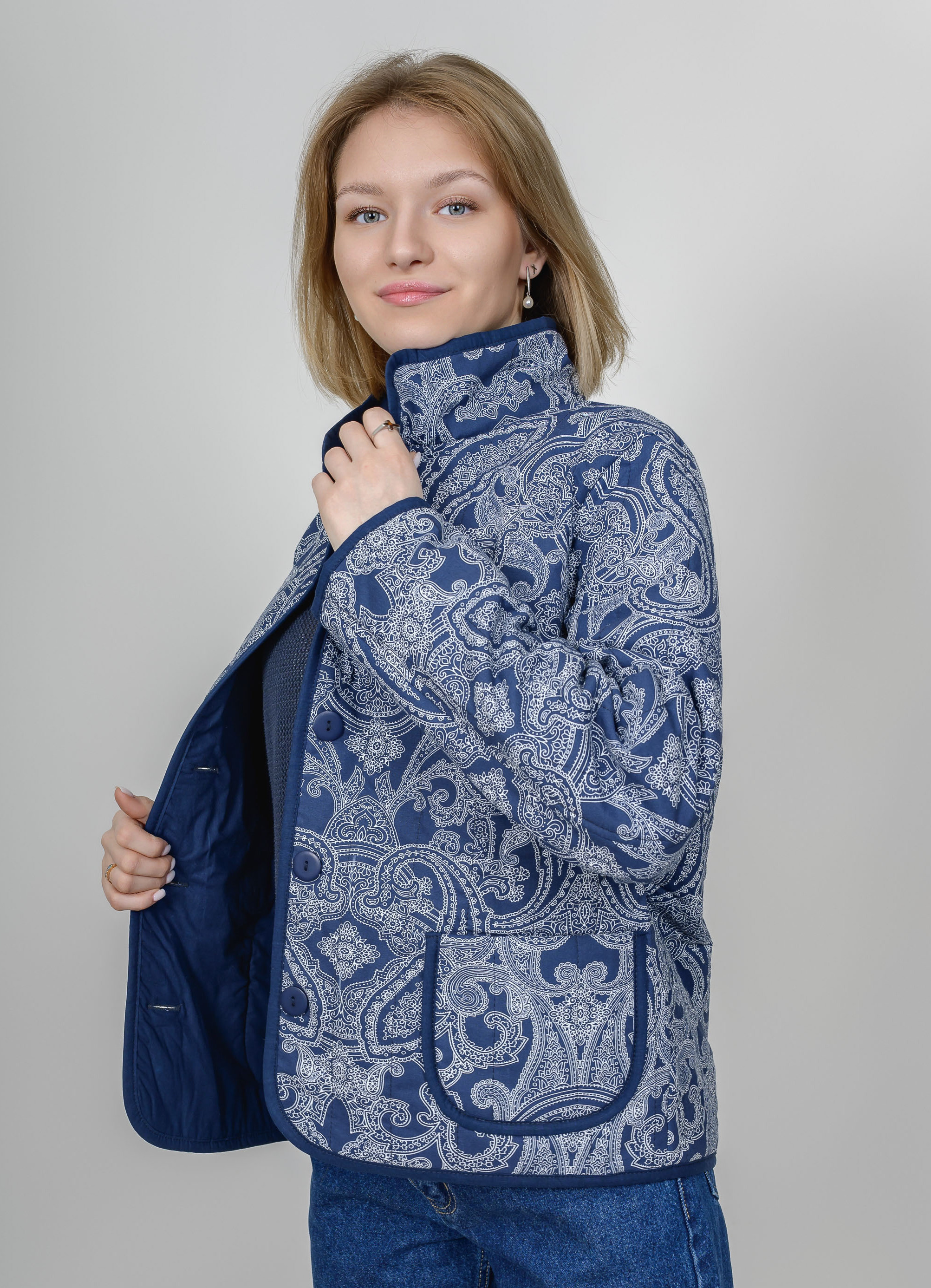 Легкая и уютная классическая куртка на натуральном утеплителе (100% хлопок). Верх и подкладка выполнены из хлопковой ткани премиум качества.  Изделие отлично стирается в домашних условиях, не прихотливо и в дальнейшем уходе. Прямой силуэт и крой с нагрудной вытачкой (размеры 52, 54, 56, 58) обеспечивают отличную посадку на фигуре любого типа.