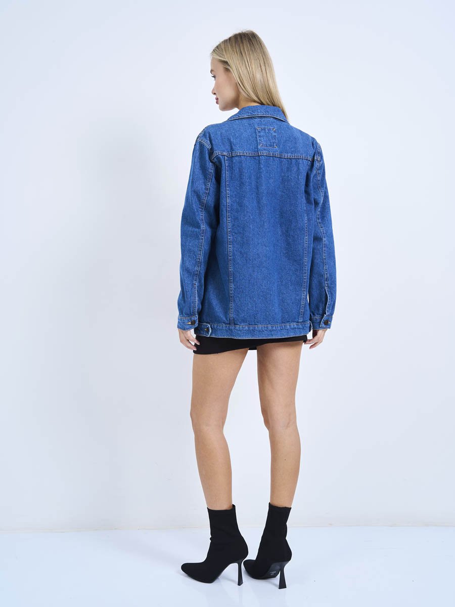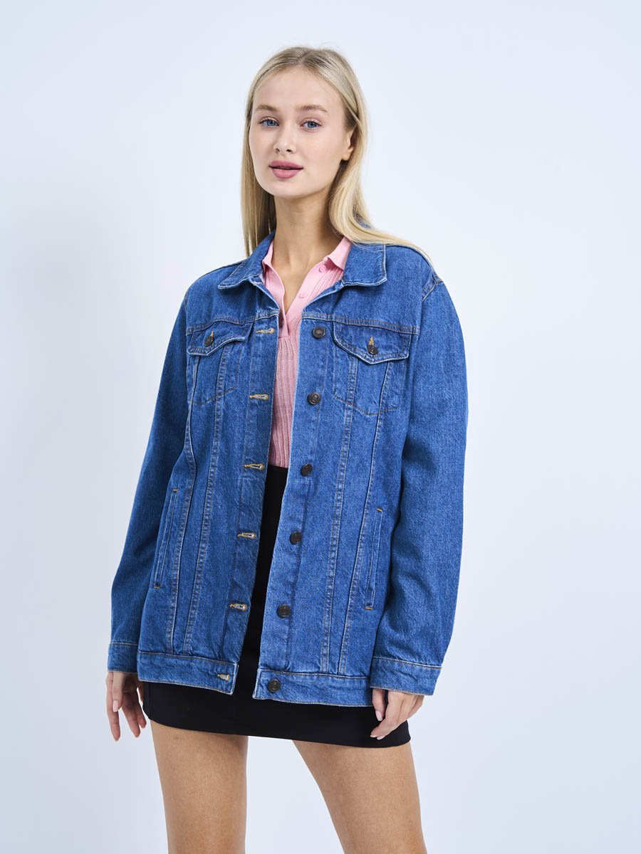 Классическая женская джинсовая куртка свободного покроя. Прямой силуэт, пройма и рукава обеспечивают комфорт и не сковывают движения; по низу рукавов манжеты, застегивающиеся на пуговицу; небольшой воротник; на груди карманы с клапаном, также застегивающимся на пуговицу; функциональные боковые прорезные карманы "в листочку"; на поясе по бокам куртки хлястик и пуговица. Выполнена из неэластичной традиционной плотной ткани denim. Классическая средняя стирка с потертостями по швам.