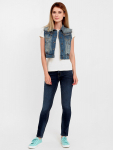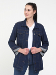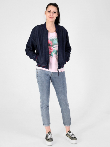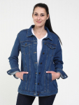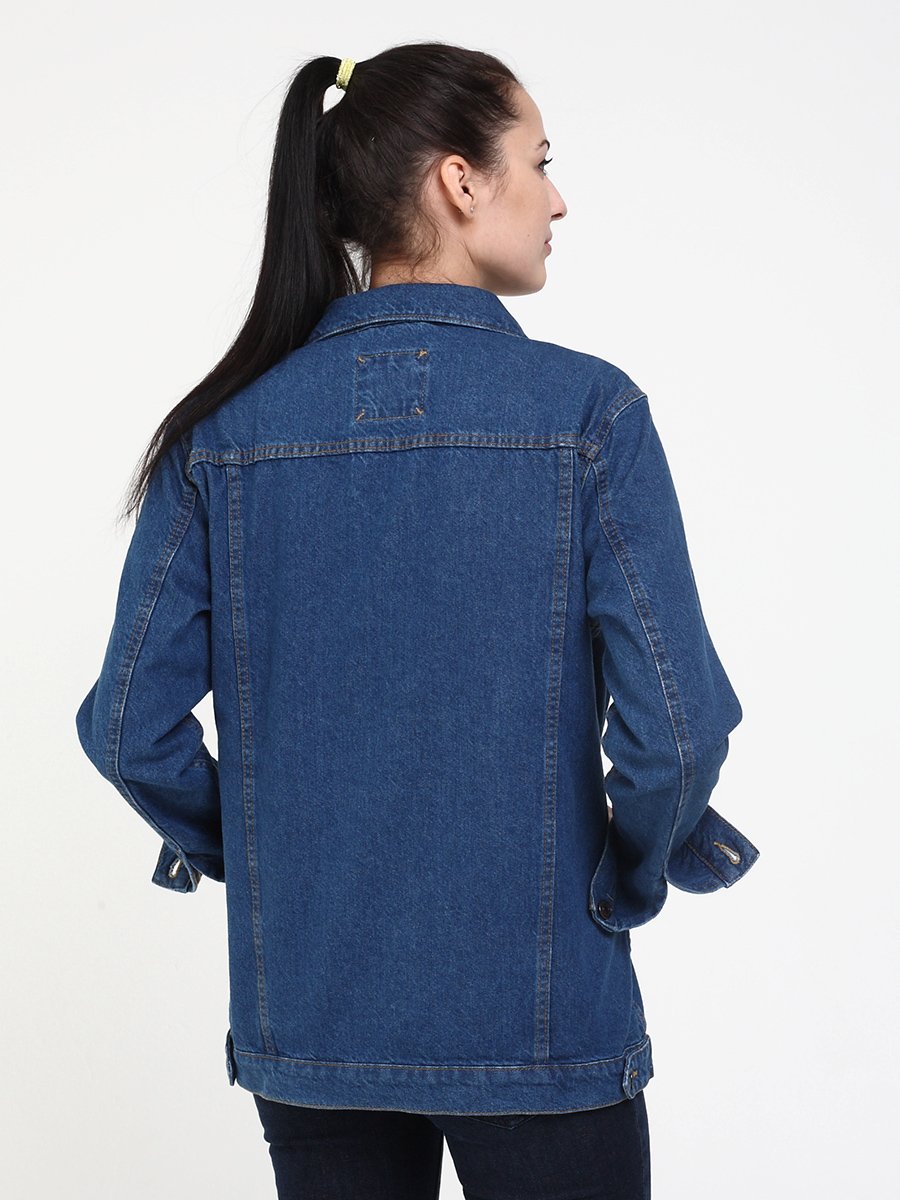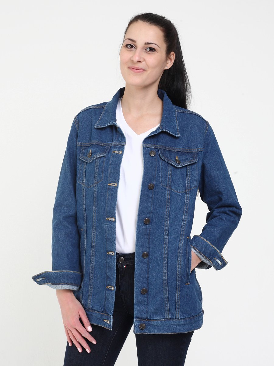 Классическая женская джинсовая куртка свободного покроя. Прямой силуэт, пройма и рукава обеспечивают комфорт и не сковывают движения; по низу рукавов манжеты, застегивающиеся на пуговицу; небольшой воротник; на груди карманы с клапаном, также застегивающимся на пуговицу; функциональные боковые прорезные карманы "в листочку"; на поясе по бокам куртки хлястик и пуговица. Выполнена из неэластичной традиционной плотной ткани denim. Классическая средняя стирка с потертостями по швам.