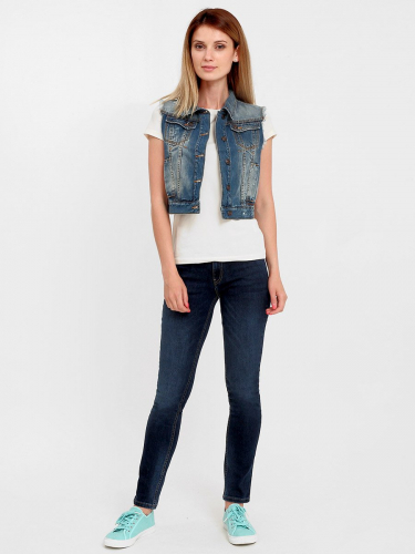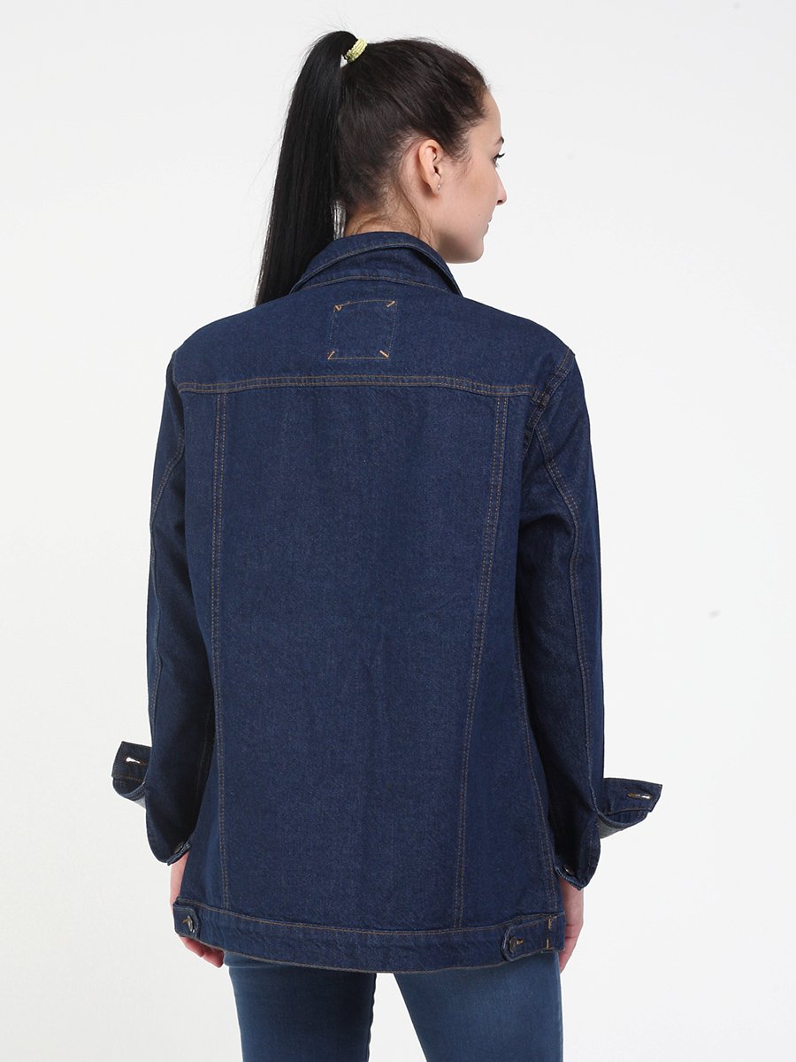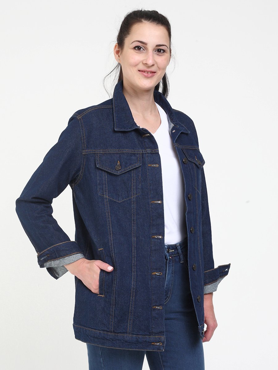 Классическая женская джинсовая куртка свободного покроя. Прямой силуэт, пройма и рукава обеспечивают комфорт и не сковывают движения; по низу рукавов манжеты, застегивающиеся на пуговицу; небольшой воротник; на груди карманы с клапаном, также застегивающимся на пуговицу; функциональные боковые прорезные карманы "в листочку"; на поясе по бокам куртки хлястик и пуговица. Выполнена из неэластичной традиционной плотной ткани denim. Классическая темная стирка.