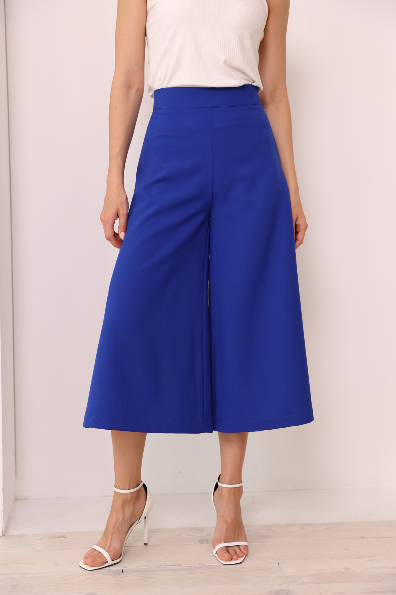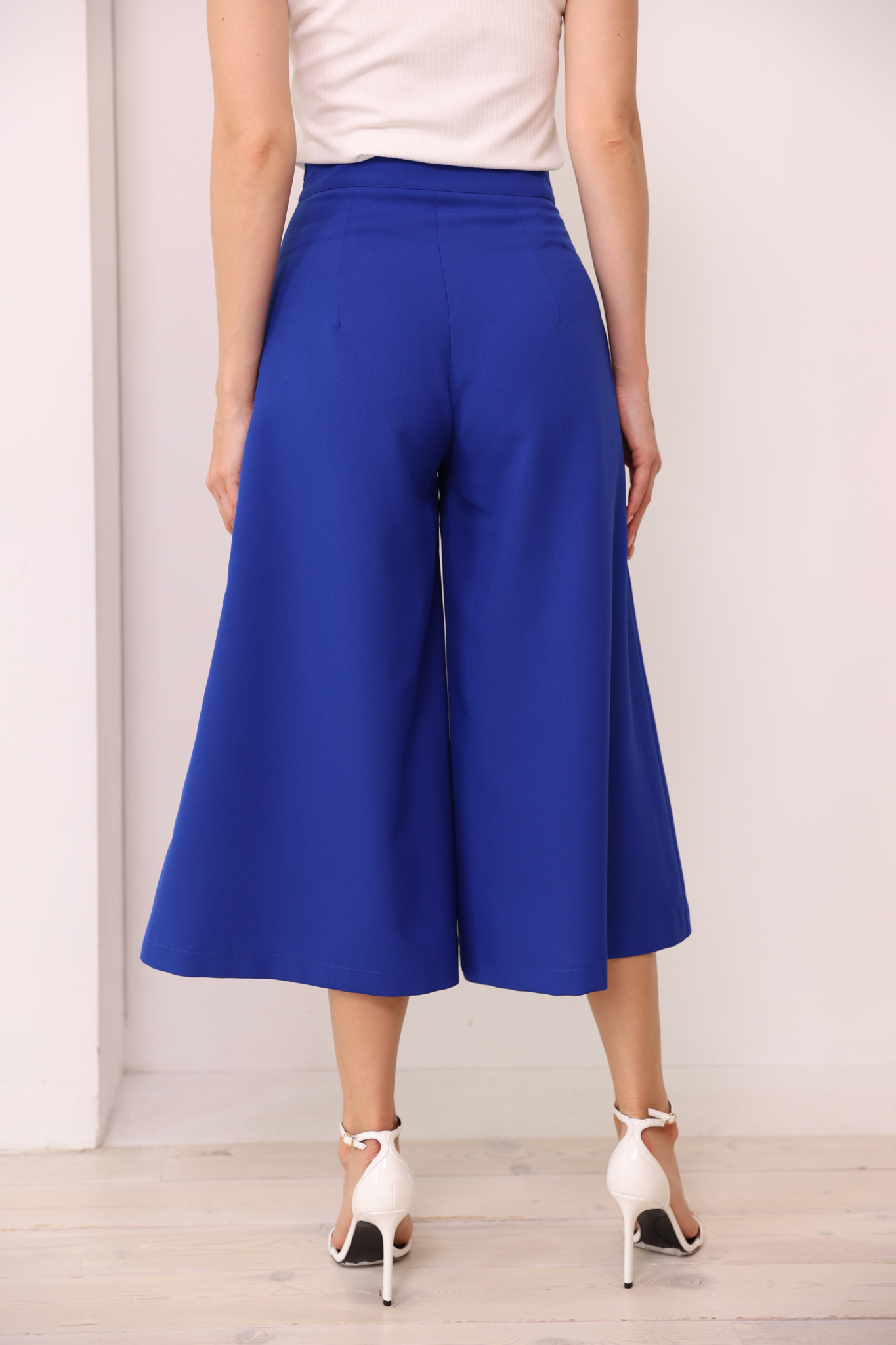 Кюлоты с высокой посадкой на талии и притачным поясом, застежка-молния в боковом шве.