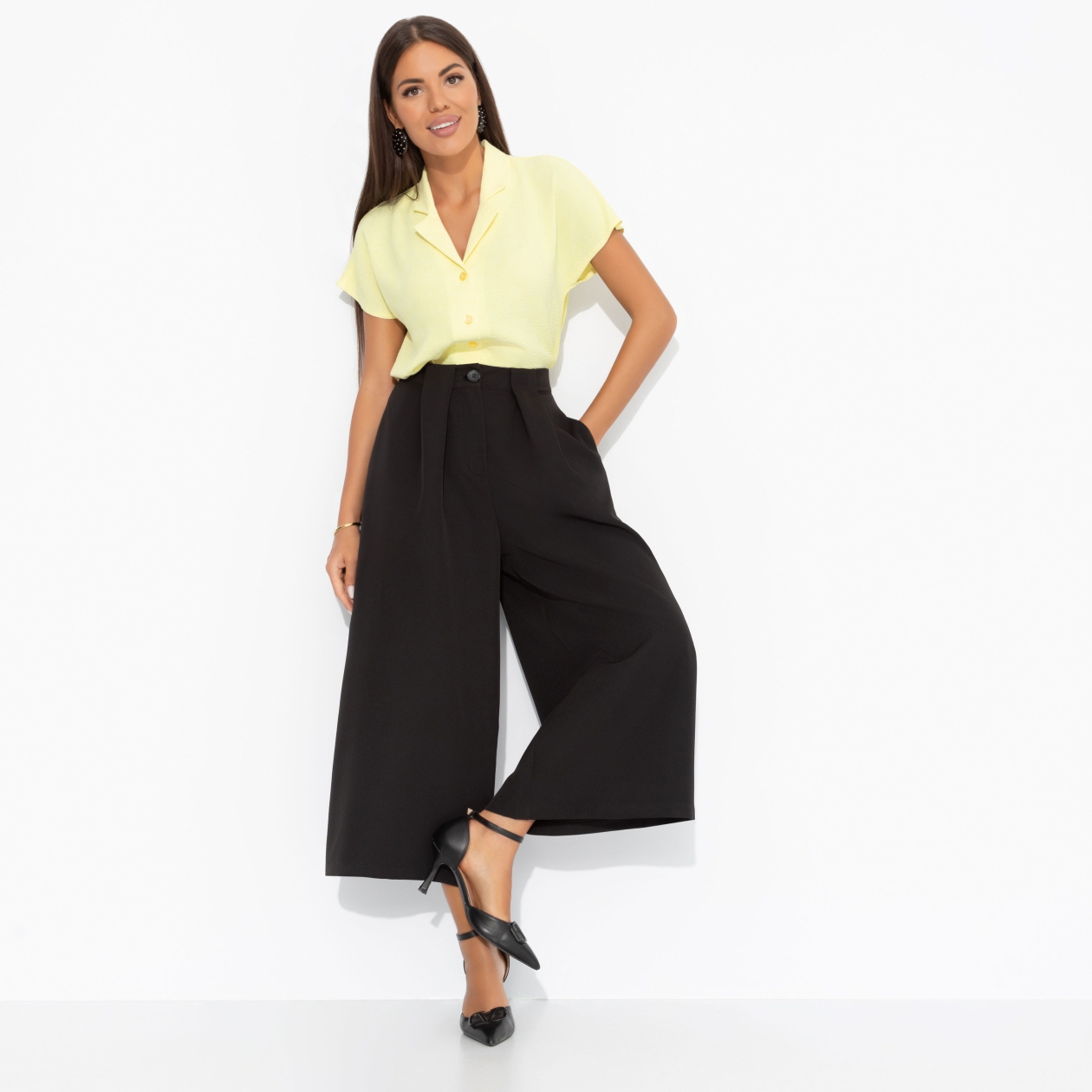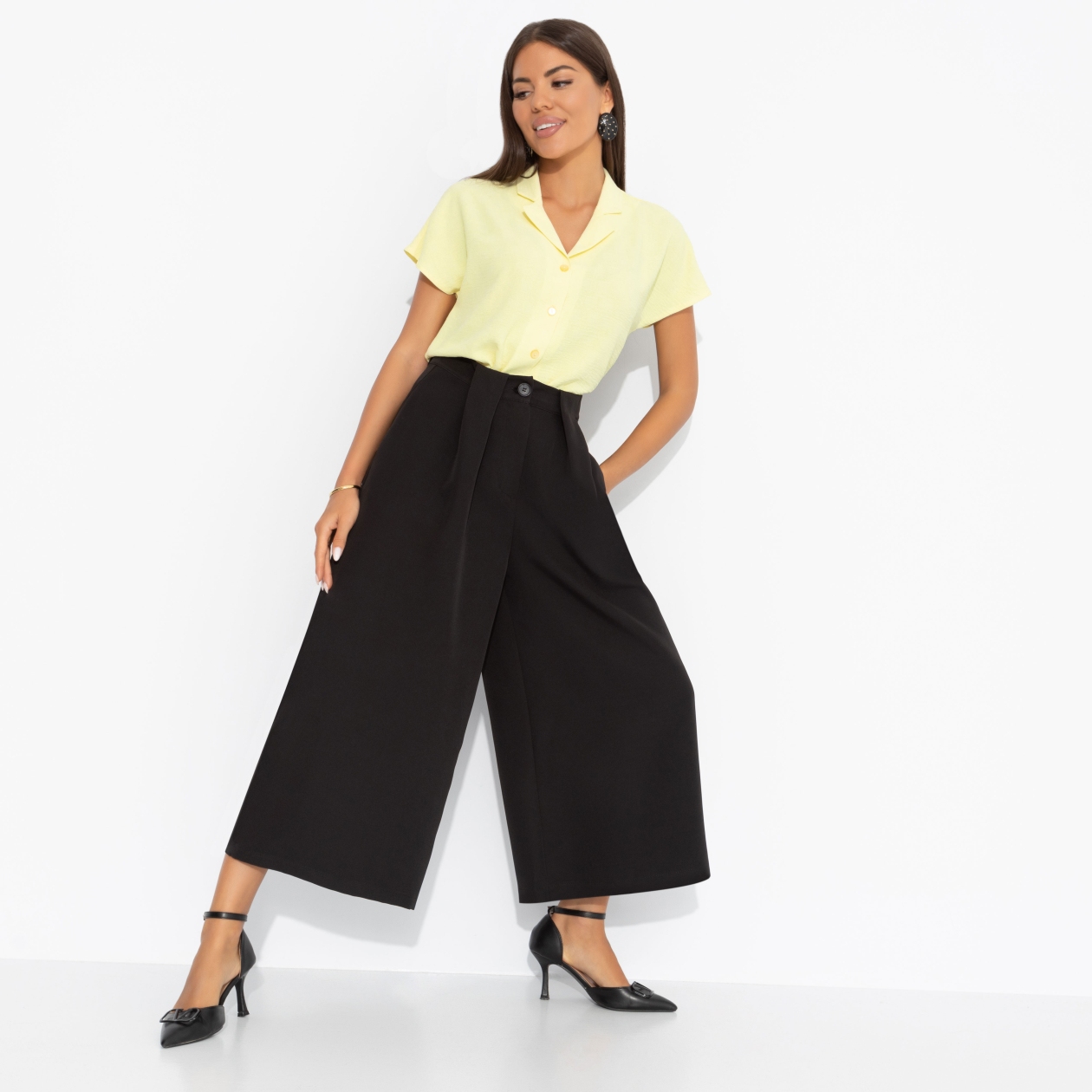 Свободный силуэт и лёгкая ткань будто отражают её рабочий ритм: стремительный, но безупречно элегантный. В кюлотах ЧАРУТТИ она двигалась легко и непринужденно по летнему офису со стопкой документов. Начальник, бросив взгляд на её безукоризненный образ, отметил, что такая женщина явно создана для большего. Кюлоты широкие. Посадка на талии. Изделия застегивается на пуговицу и молнию. Дезайнерские шлевки-защипы по верхней части изделия. Кюлоты с карманами.
