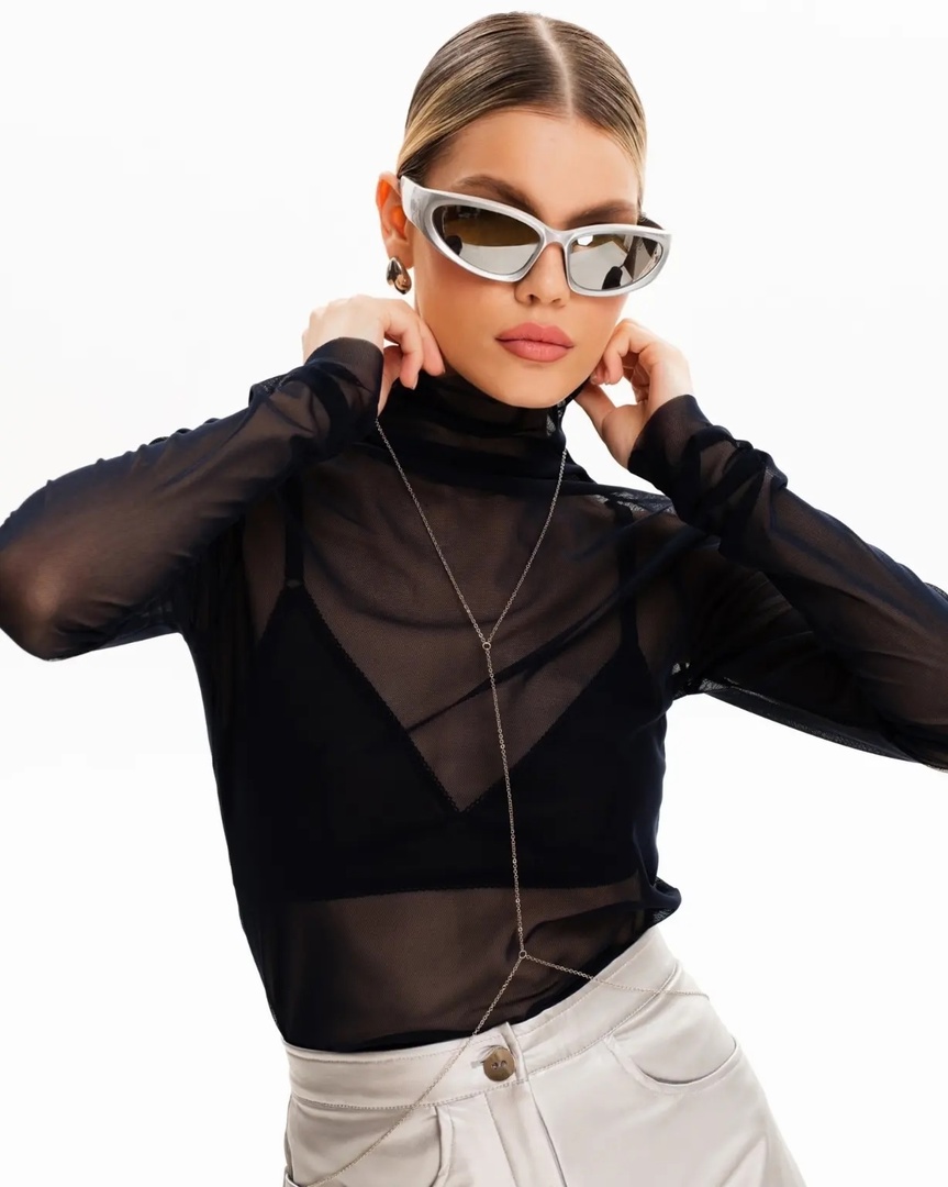 Прозрачная водолазка из нежной сеточки в новом цвете станет отличным компаньоном к твоему жакету днём и к стильному бра - вечером.