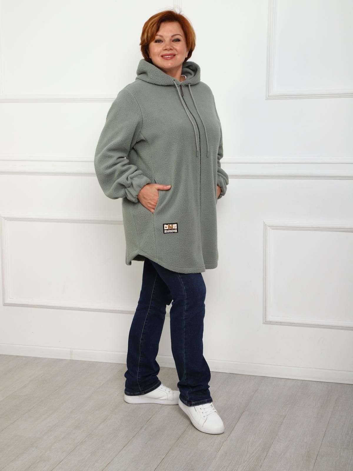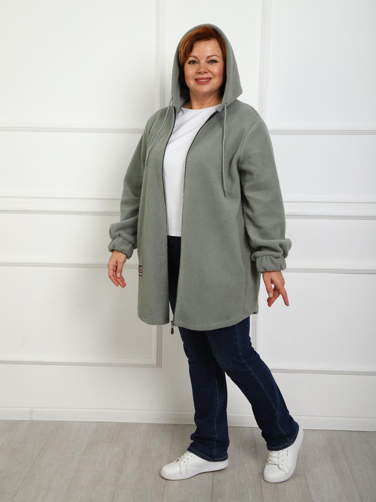 Парка выполнена из флиса барашек. Модель удлиненного кроя на молнии с внутренними карманами. Низ изделия имеет небольшие закругления, капюшон с люверсом и шнурком, длинный рукав с манжетом на резинке.