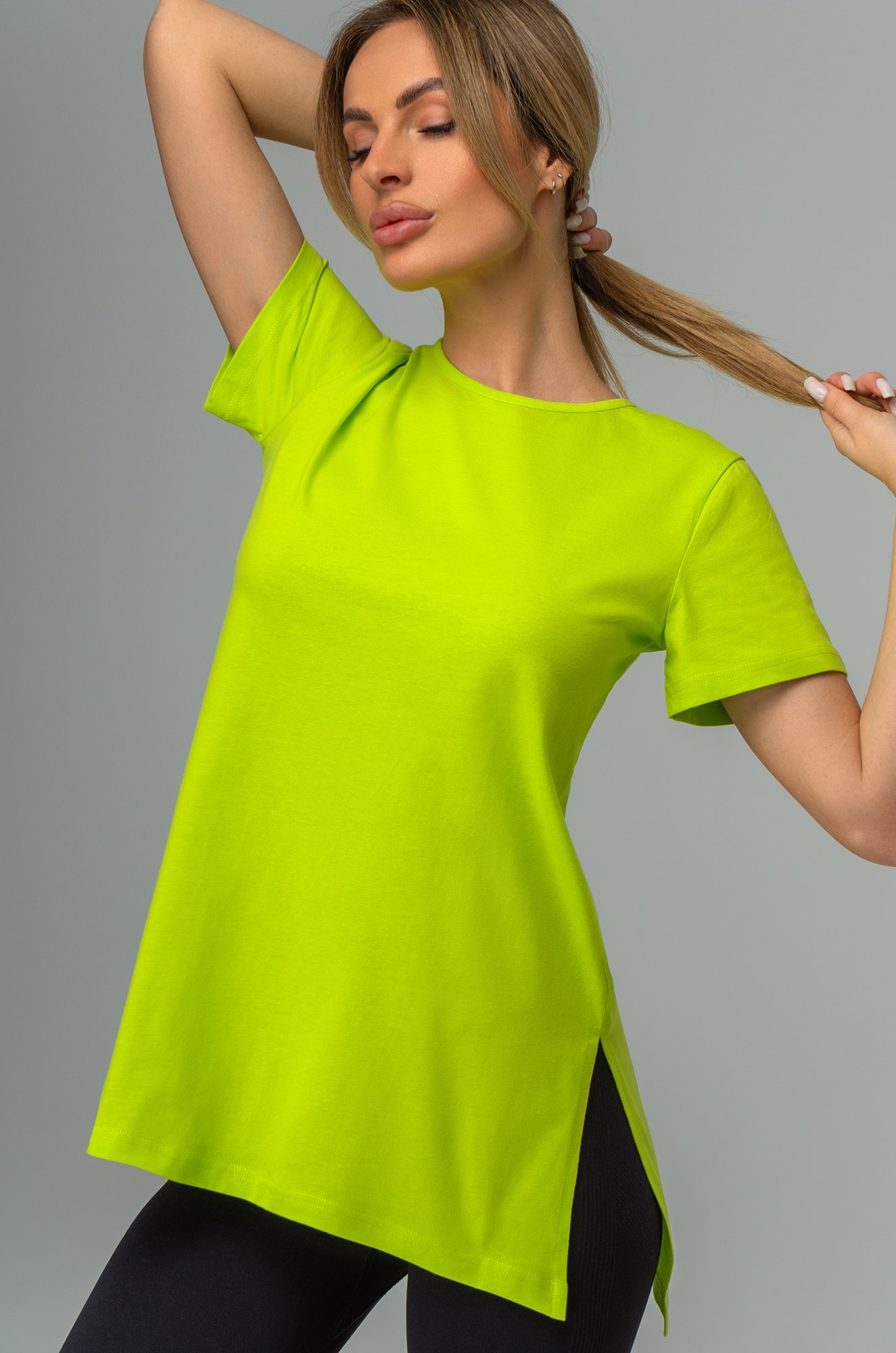 Женская футболка туника оттенка лайм — универсальная модель, в которой легко быть собой. Длинный слегка приталенный крой подчеркивает фигуру, а мягкий хлопковый трикотаж делает её идеальным выбором на каждый день. Удлиненная футболка создана для тех, кто ценит комфорт, естественность и спокойную эстетику без лишних деталей.