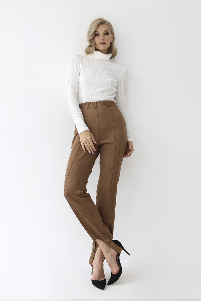 Леггинсы из искусственной замши с притачным поясом на резинке и штрипками, которые регулируются по длине. По переду стрелка зафиксирована строчкой по всей длине.