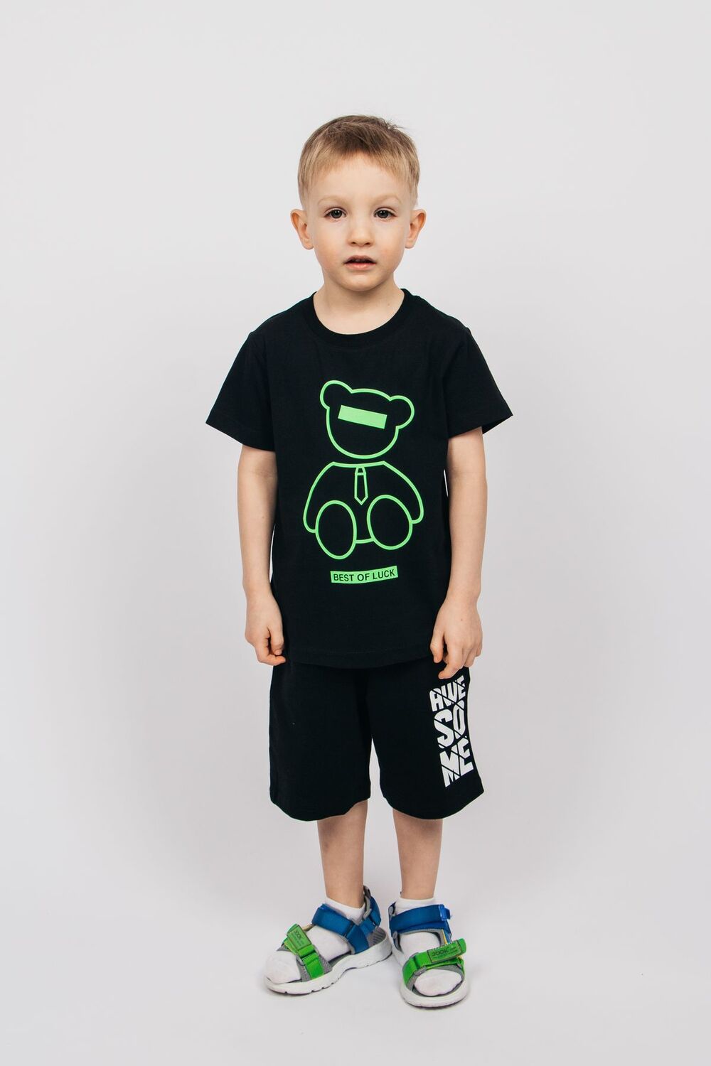 Футболка для мальчика выполнена из 100% хлопка. Футболка прямого силуэта, с втачным коротким рукавом. Благодаря эластичной горловине, выполненной из рибаны, футболку удобно снимать и надевать. На полочке принт Шелкография с неоновыми красками. Надпись переводится как Желаю удачи. Материал не растягивается и не деформируется.