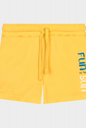 Шорты для мальчика прямого силуэта из кулирки. Пояс отрезной в цвет изделия, выполнен из кашкорсе. По поясу шорт вставлен плоский утягивающий шнурок в цвет изделия, шнурок закреплен отстрочкой вдоль пояса. Низ изделия обработан швом в подгибку. На передней левой половинке шорт принт Шелкография. Надпись переводится как Веселье на солнце.