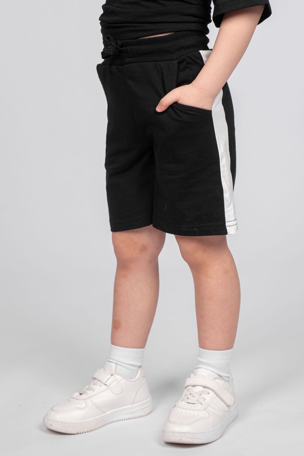 Шорты для мальчика прямого силуэта. Пояс отрезной в цвет изделия, выполнен из кашкорсе, с эластичной тесьмой внутри. По поясу шорт вставлен плоский утягивающий шнурок, в цвет изделия. По боковому шву втачаны лампасы. Низ изделия обработан швом в подгибку. В боковом шве карман с отрезным бочком.
