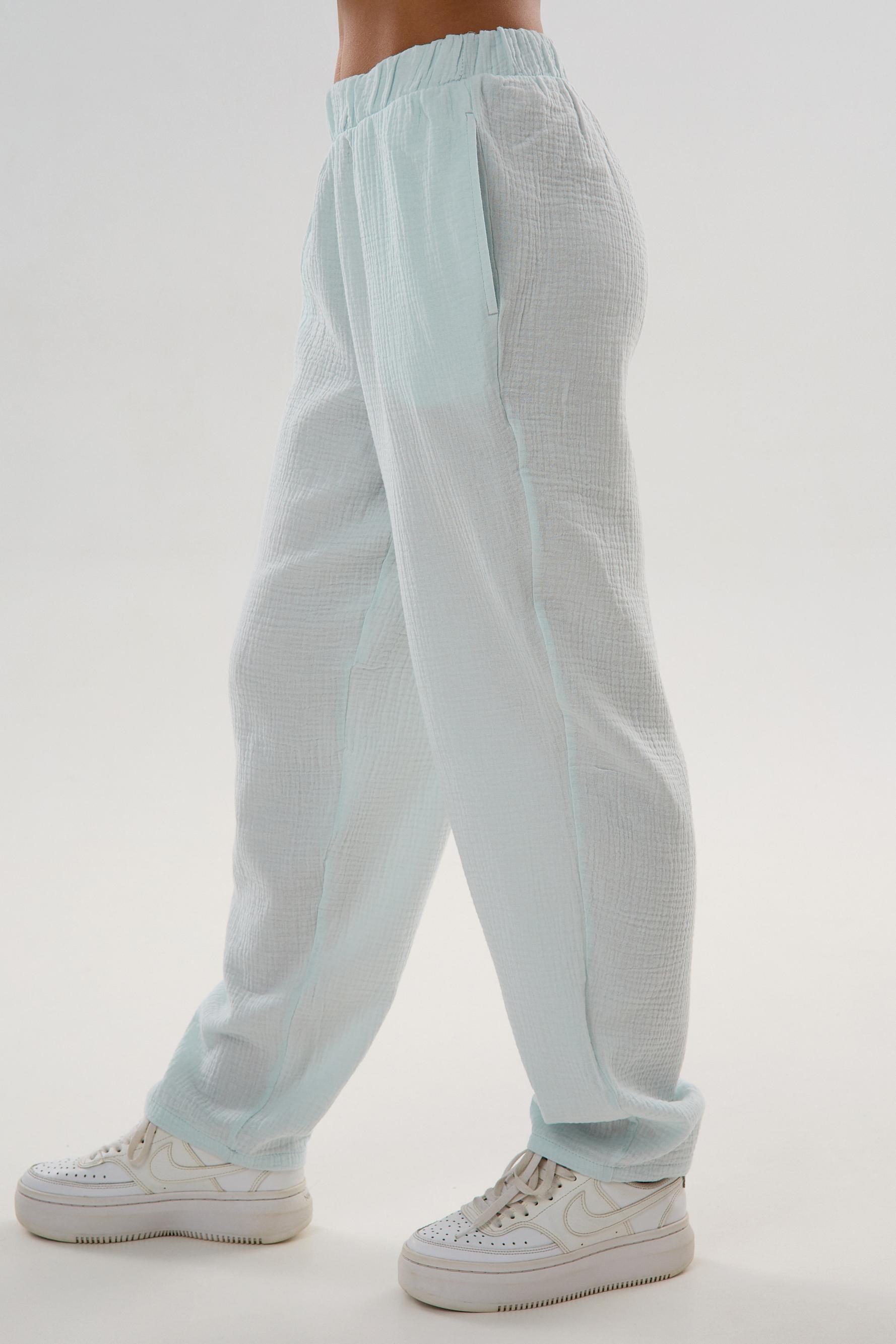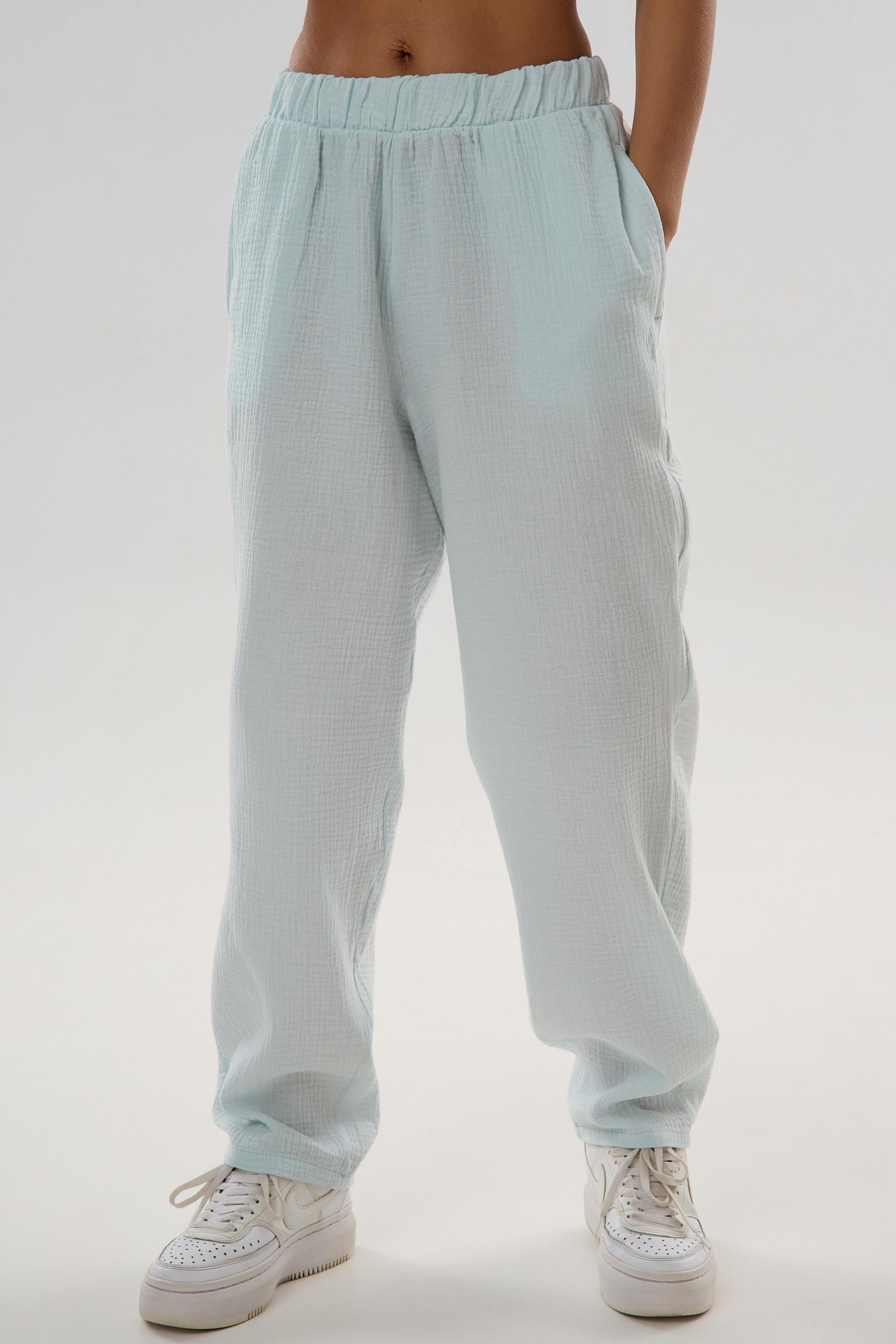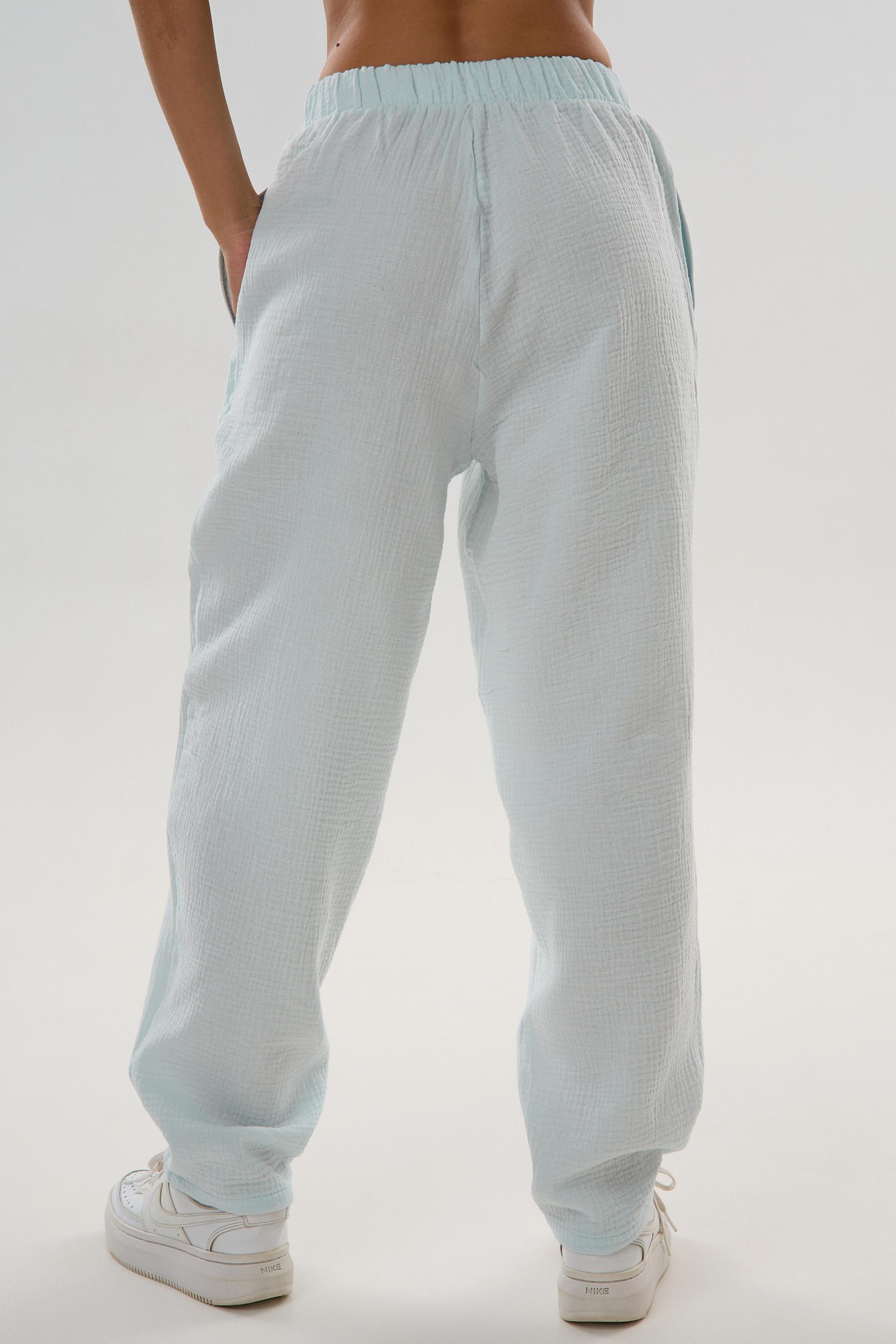 Брюки Муслин, мягкие, выполнены из дышащей хлопковой ткани с интересной фактурой. Свободные и удобные, с красивой, комфортной посадкой. Карманы в боковых швах .Декоративная отстрочка по поясу. Универсальная модель, в которой легко быть красивой и нежной.