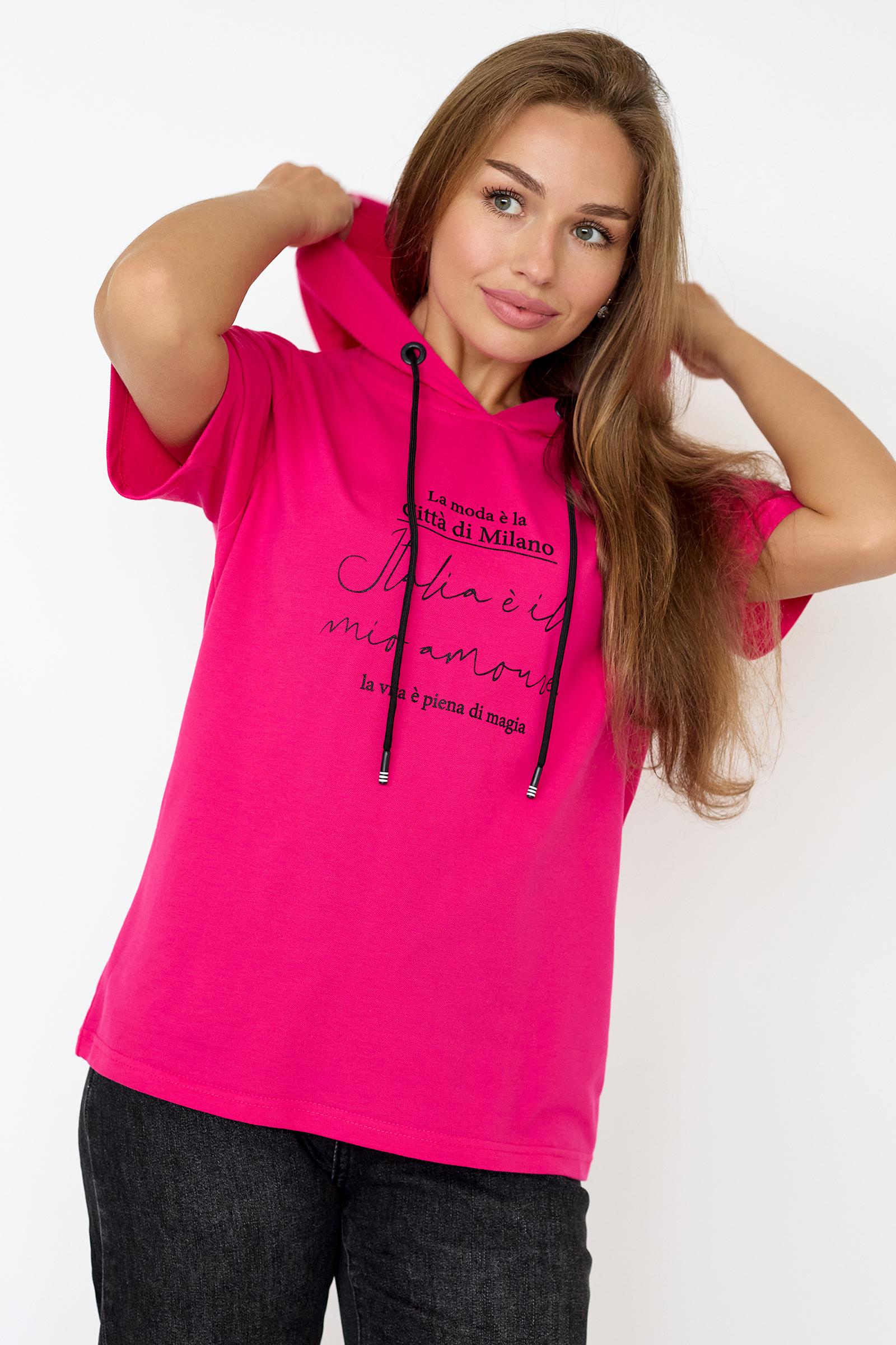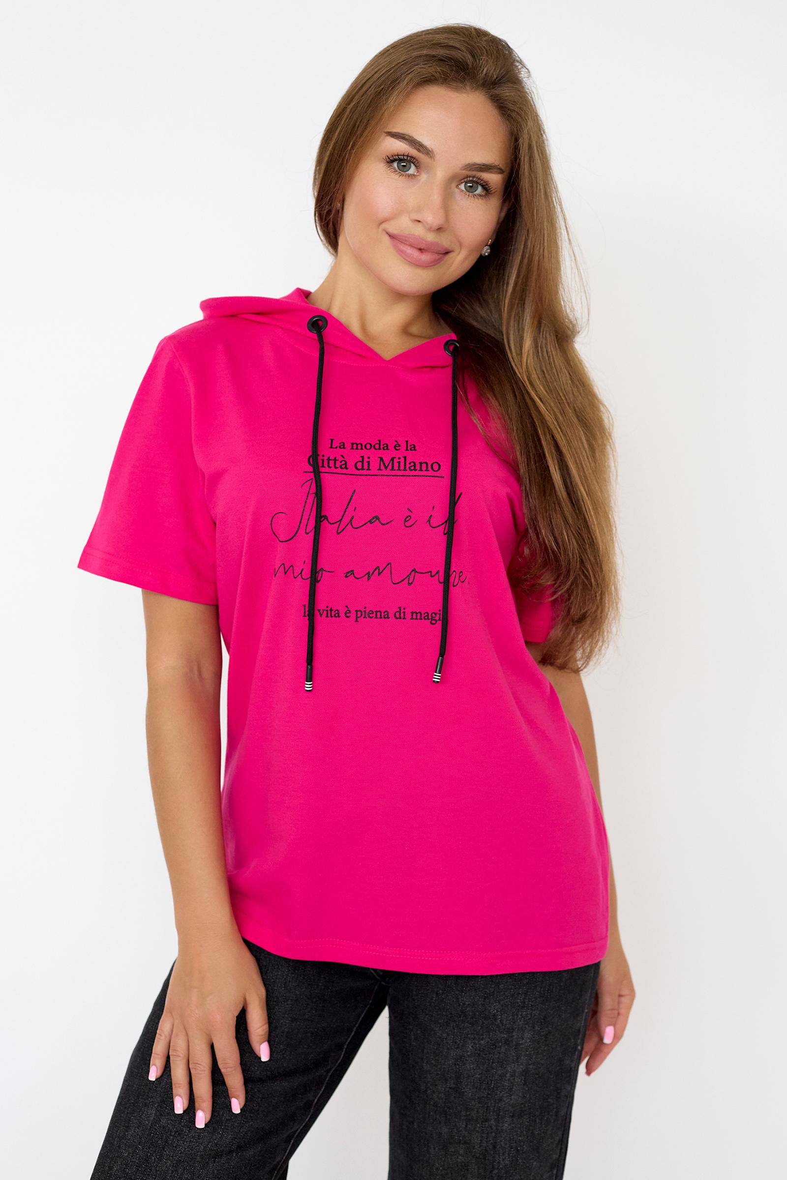 Спортивная футболка Трейси с капюшоном. Ткань Лакоста практична и удобна в повседневной носке. Футболка не мнется, пропускает воздух и максимально комфортна во время прогулок, занятий спортом или домашними делами. Стильная футболка с дизайнерским принтом и регулирующим шнурком выглядят модно и уникально.