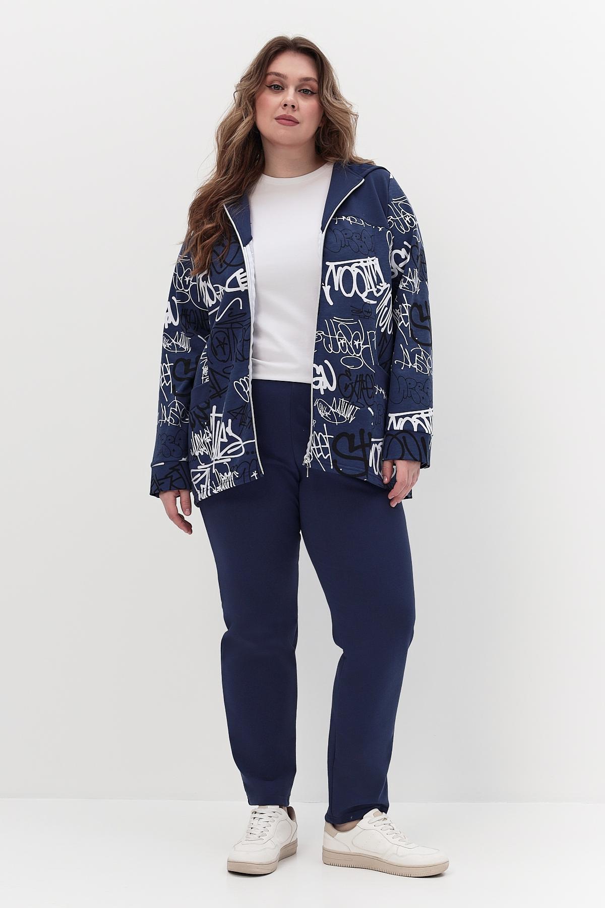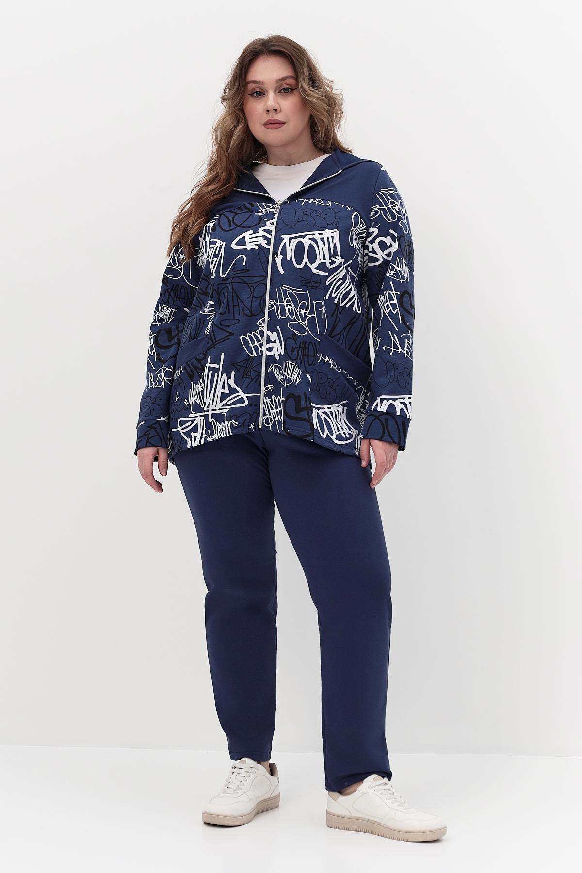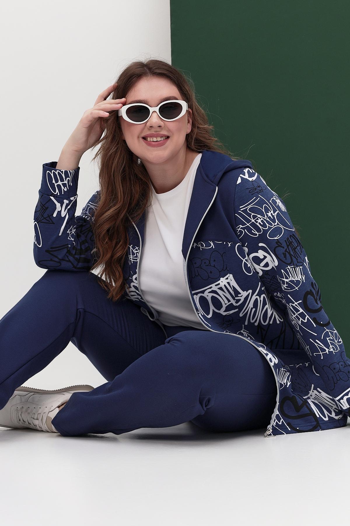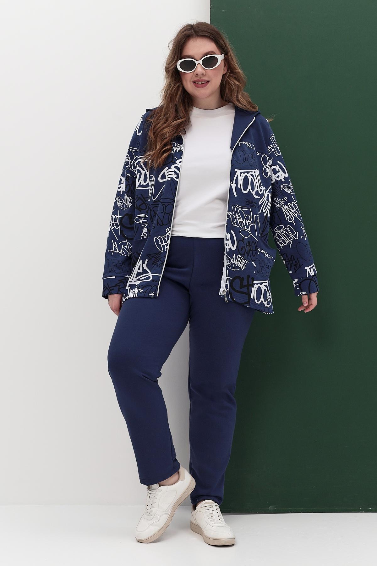 Костюм, в который можно влюбиться с первого взгляда. Белые буквы на темном синем фоне пленит своим красивым сочетанием. Сам костюм очень удобен и комфортен для ношения. Куртка прямого кроя с карманами, капюшоном и застёжкой на молнию. Основание куртки с рисунком, а кокетка и капюшон выполнены из однотонной ткани. Брюки прямые, в однотонном синем цвете. Удобную посадку изделия обеспечивает поясная резинка. Прекрасный костюм для дома, отдыха или спорта.