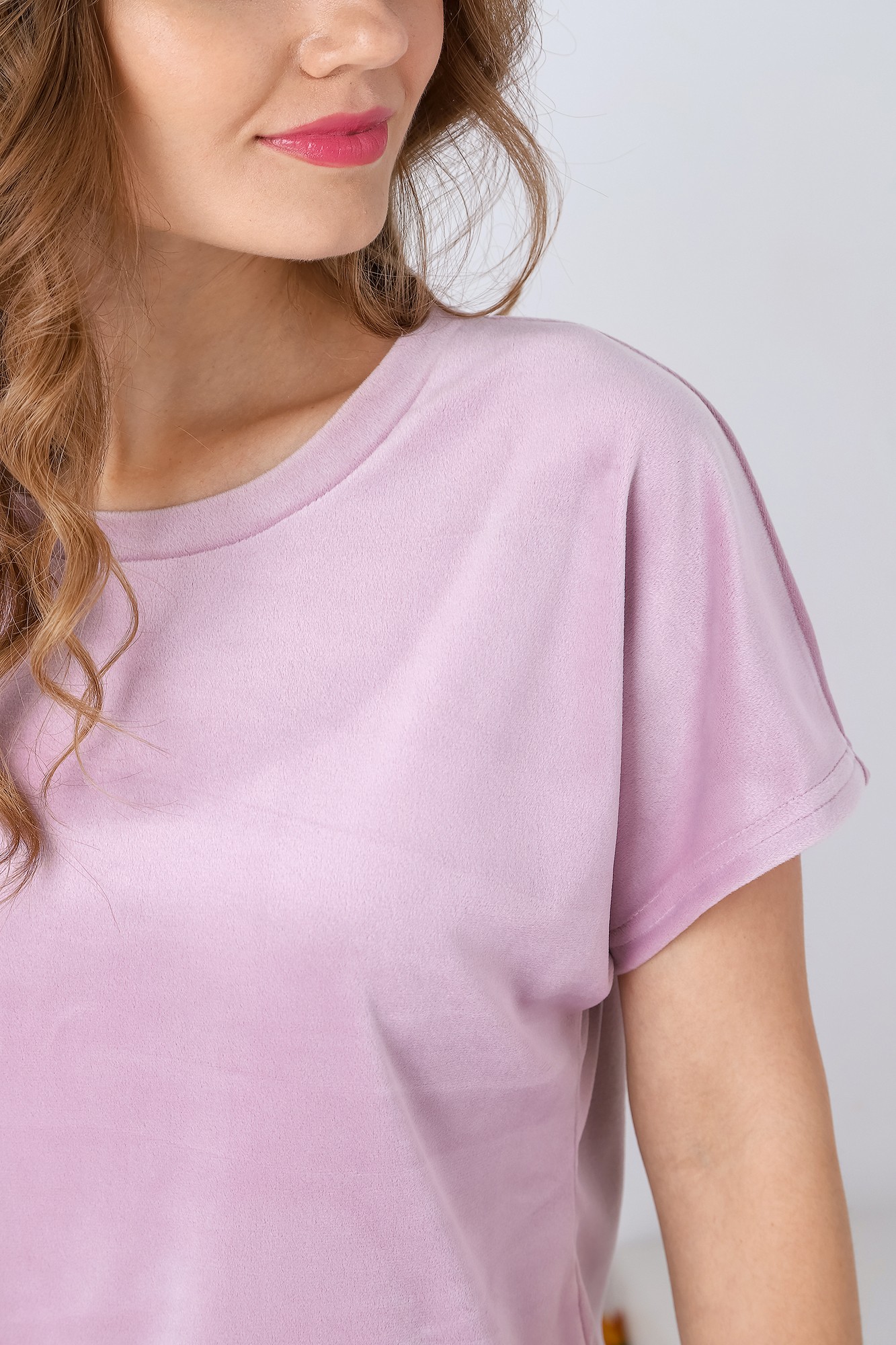 Костюм молодежный из трикотажного полотна «велюр-стрейч», состоящий из футболки и шорт.