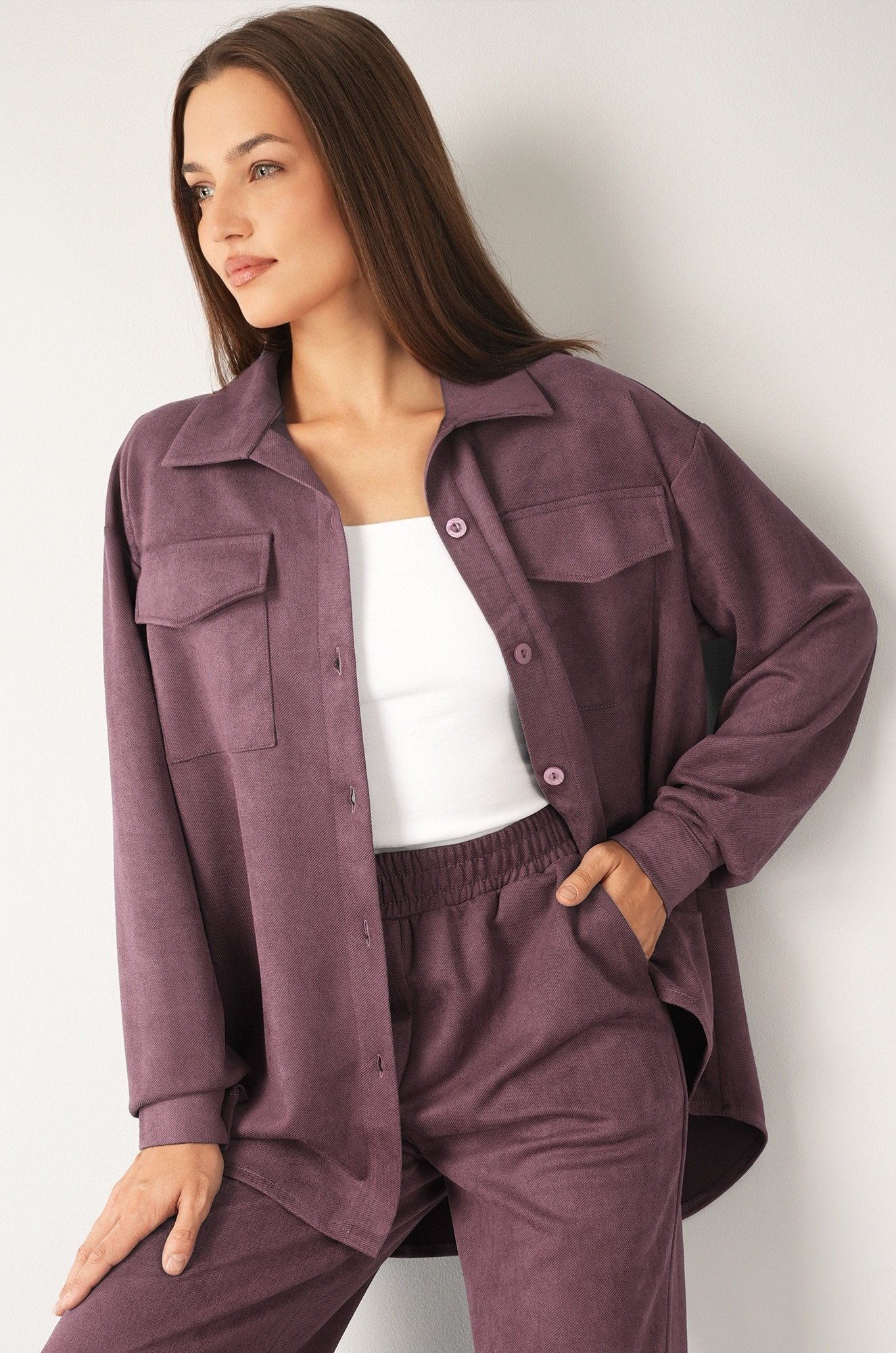 Брюки палаццо на резинке и рубашка оверсайз с нагрудными карманами создают женский комплект, который одинаково уместен для девушек и женщин и в офисе, и на прогулке. Сиреневый вельветовый костюм будет незаменим как базовый, даря комфорт в осенний или весенний сезон.