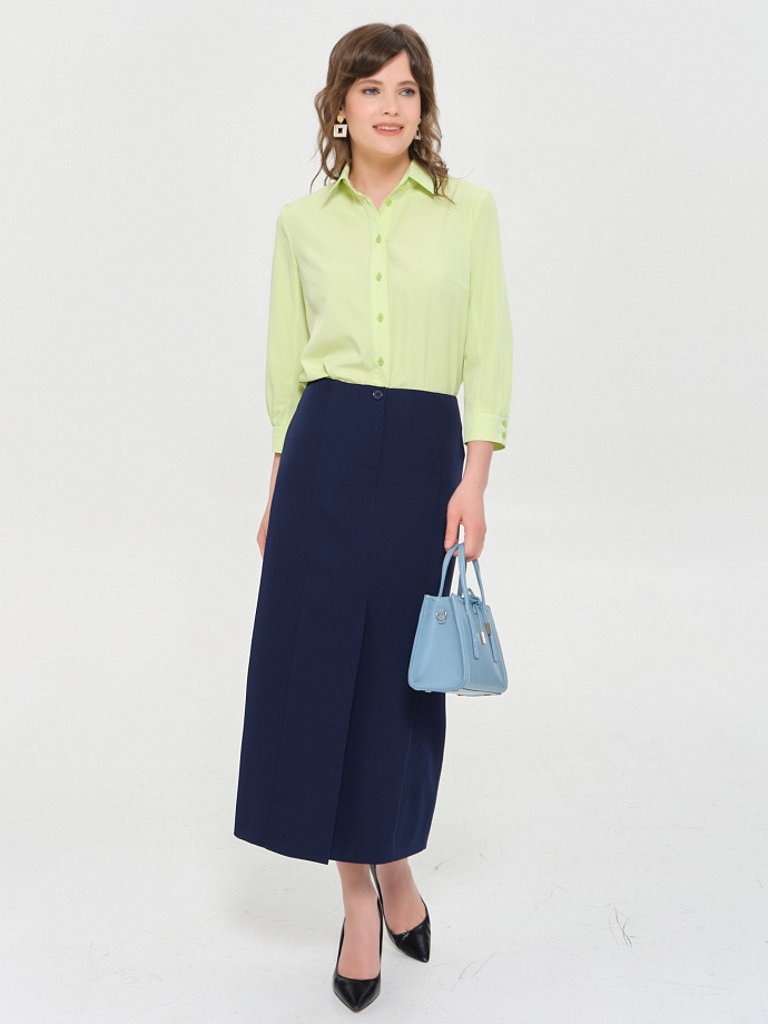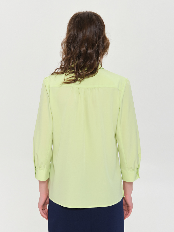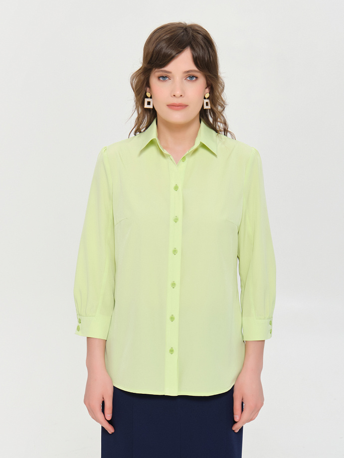 Модель прямого силуэта. Спереди планка с застёжкой на петли и пуговицы. Спинка с двухслойной кокеткой, под кокеткой сборка. Рукав с небольшой сборкой по окату и низу, застегивается на 2 петли и пуговицы. Воротник сорочечный. В боковых швах декоративные разрезы.