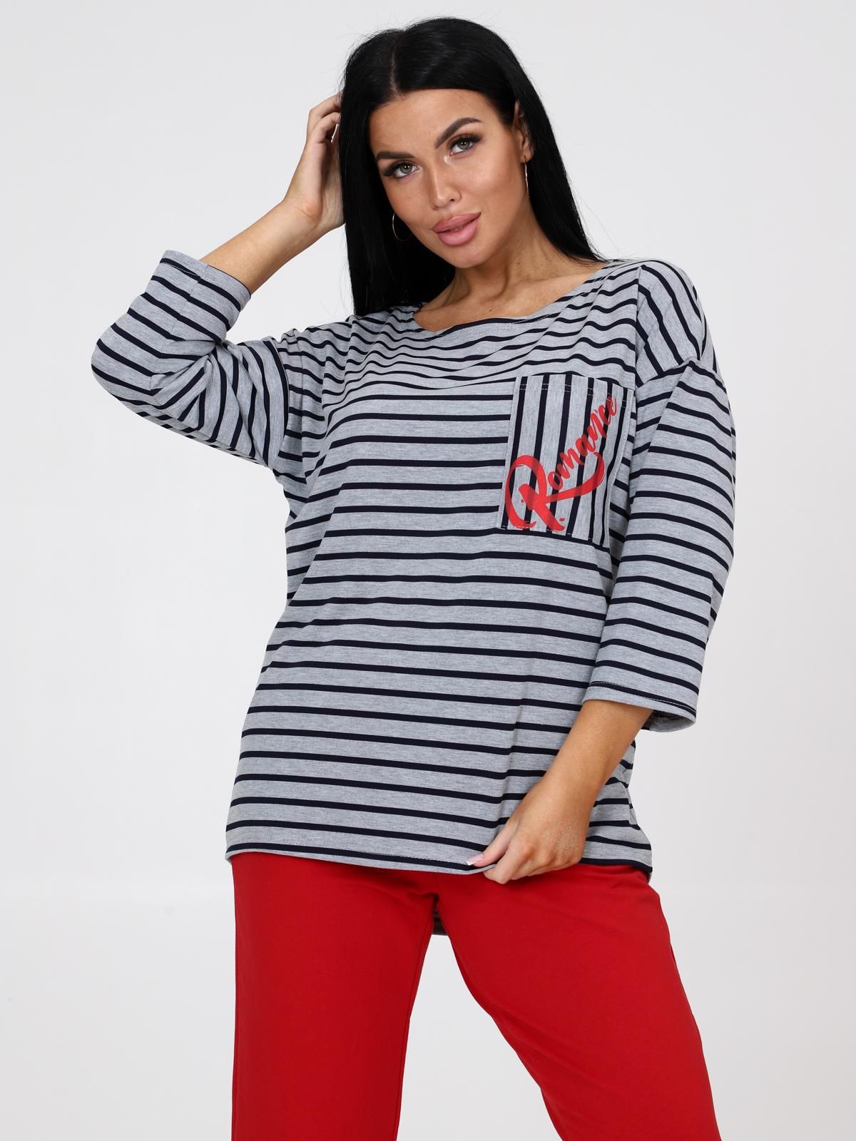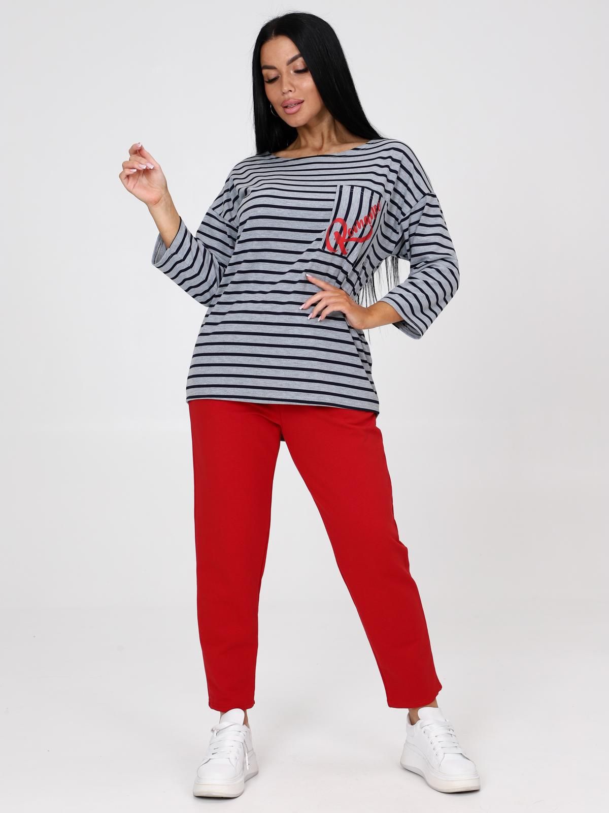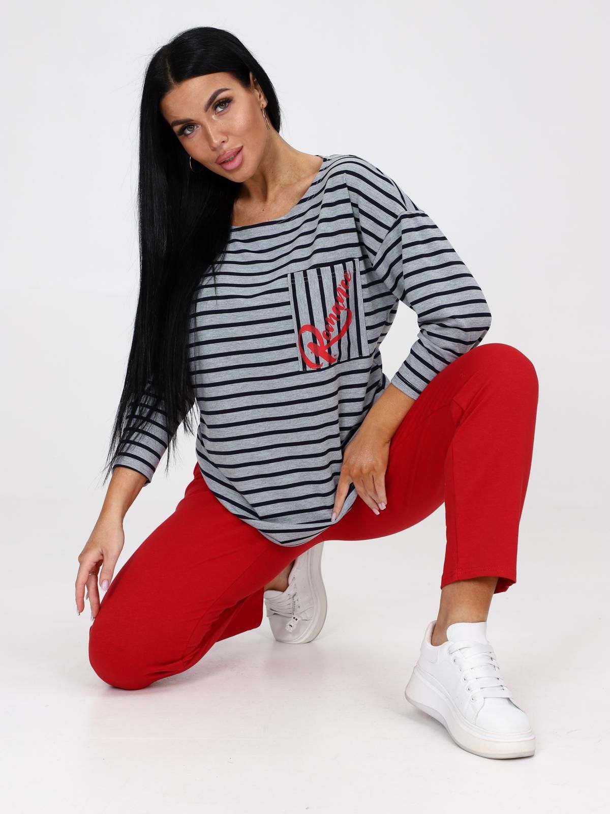 Женский костюм состоит из футболки и брюк. Брюки длиной 7/8 с карманами в боковых швах. Футболка удлинённая прямого силуэта со скруглённой линией низа спинки. Рукав длиной 3/4. На полочке кармашек с принтом в цвет брюк.