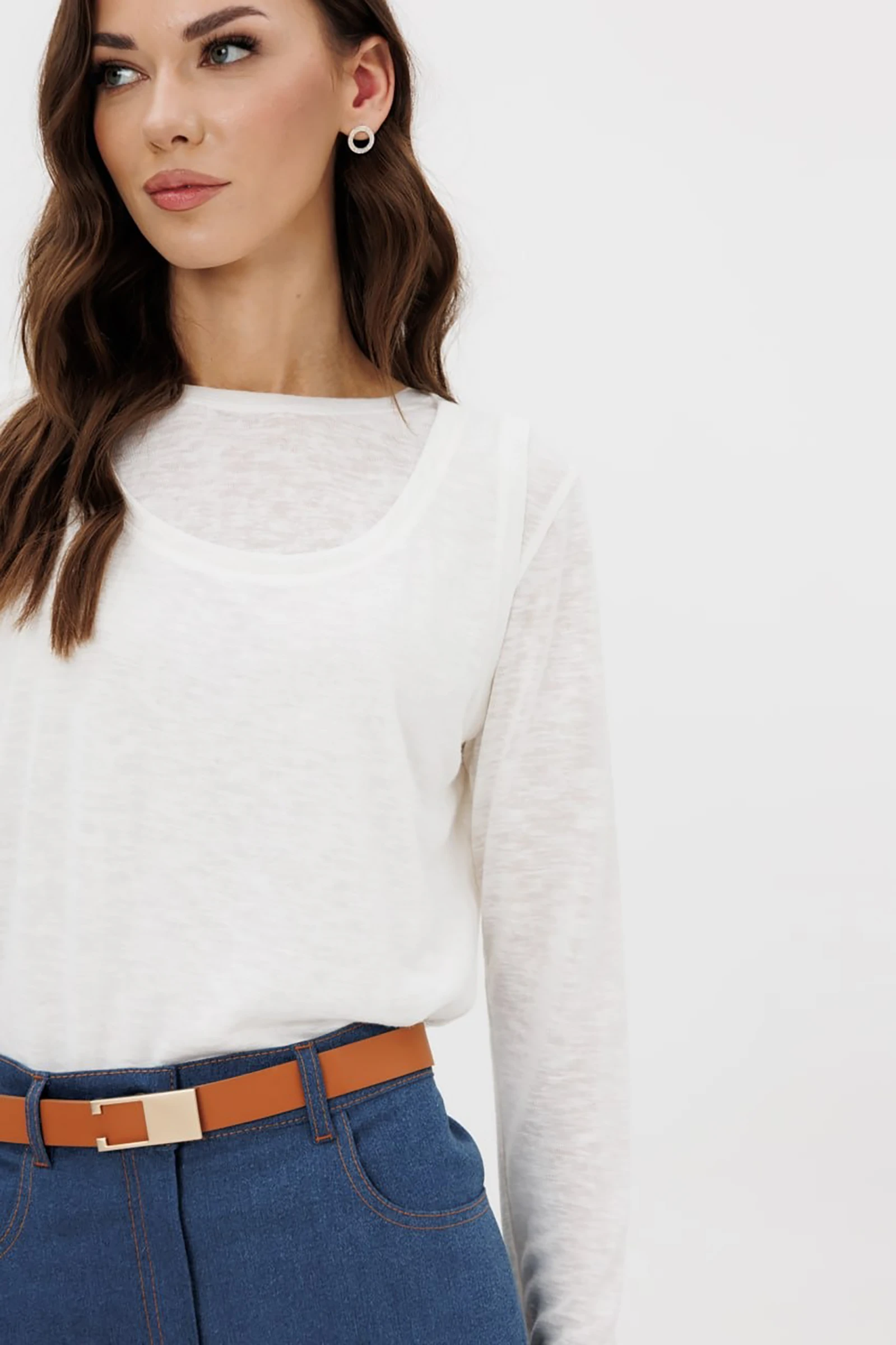Лонгслив-это идеальное решение для создания расслабленных образов на каждый день простых нарядов на выход, а сочетание его с майкой из того же полотна-простой и элегантный вариант, чтобы сделать образ еще более интересным. Полуприлегающий силуэт, втачной покрой, круглая горловина, длинный зауженный рукав. Майка полуприлегающего силуэта с углубленной круглой горловиной. Длина лонгслива около 60 см. Длина рукава около 60 см Длина майки около 56 см.