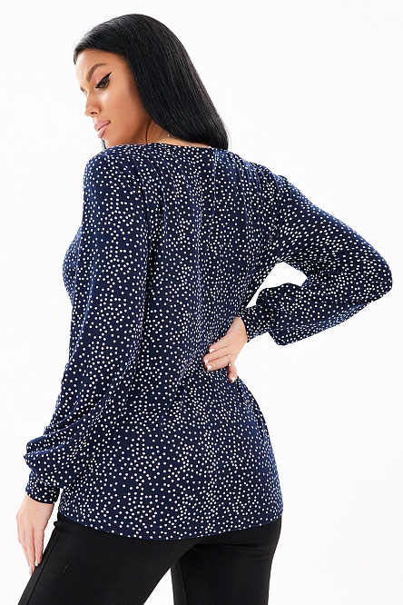 Лонгслив свободного кроя с небольшими складками по линии горловины и с элегантным пышным рукавом, который завершается удобной манжетой.