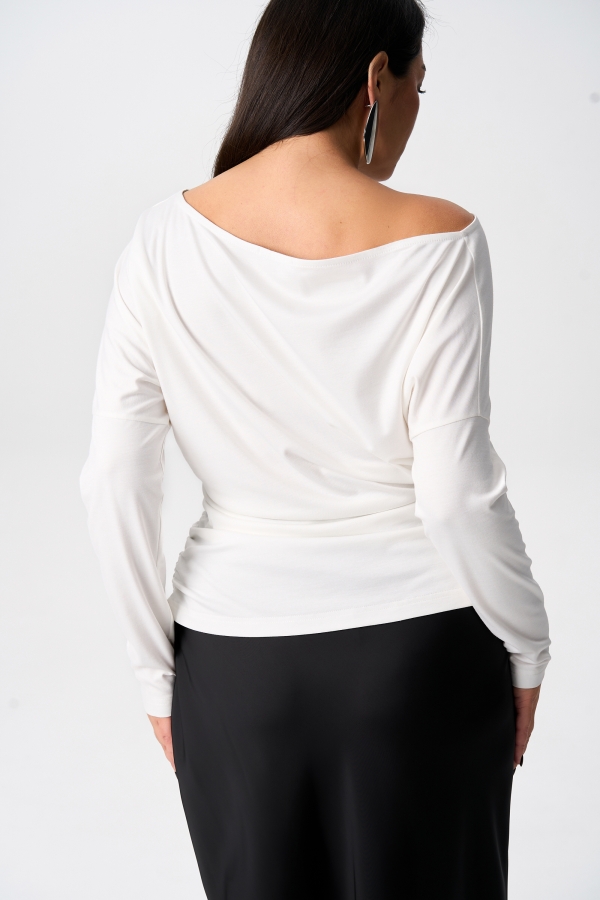 Лонгслив ассиметричного кроя из вискозного трикотажа. Модель со спущенным плечом. Рукав длинный, цельнокроеный.