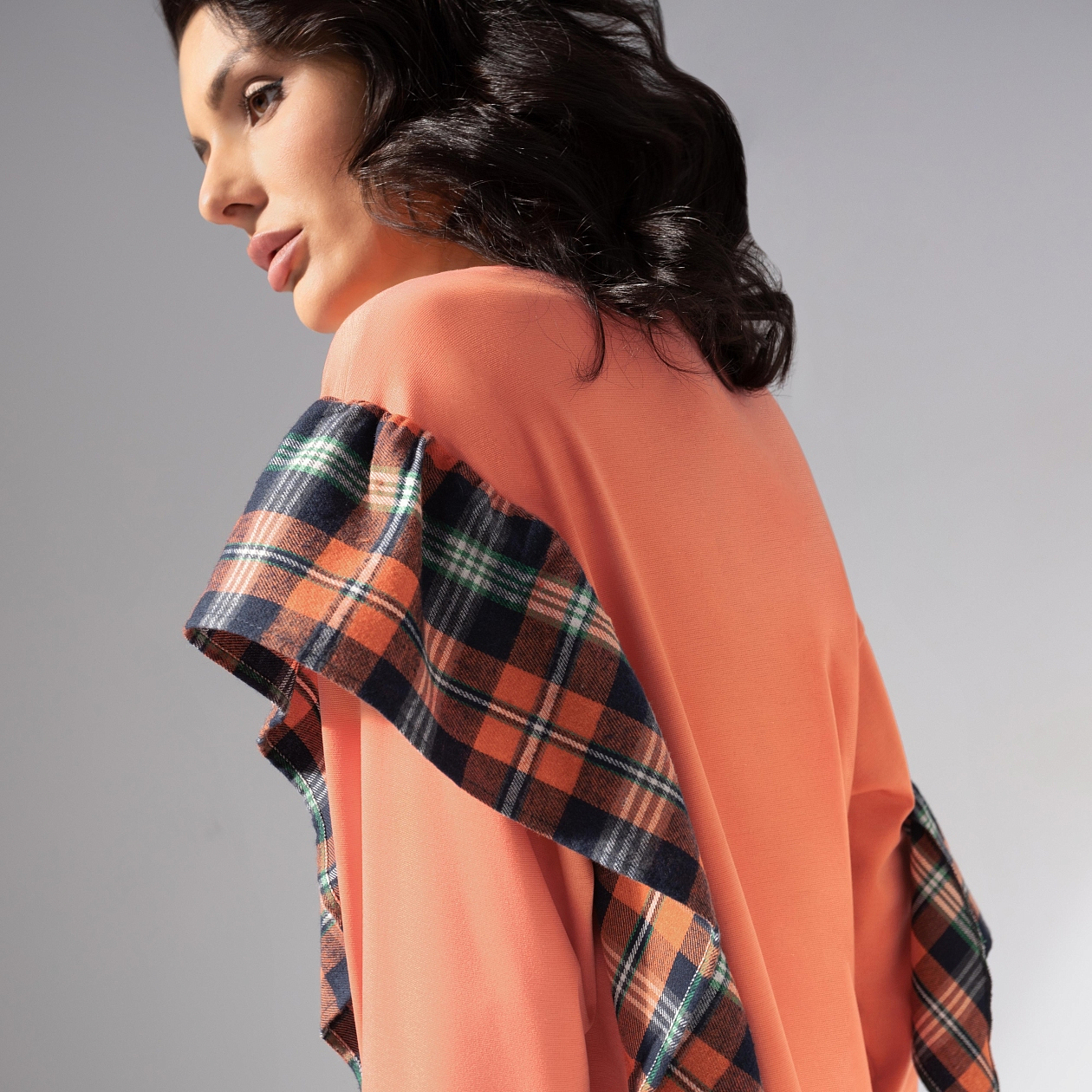 Лососевый оттенок – фаворит сезона, сочетающий мягкость и статус. Лонгслив ЧАРУТТИ создаёт настроение уверенной женственности, будто говорит: «Я выбираю комфорт и стиль, без компромиссов». Комфортный лонгслив из эластичного трикотажа антипилинг и клетчатой фланели. Воланы по рукавам добавляют динамику образу. Свободный крой, круглый вырез. Трикотаж пластичный, лёгкий в уходе.