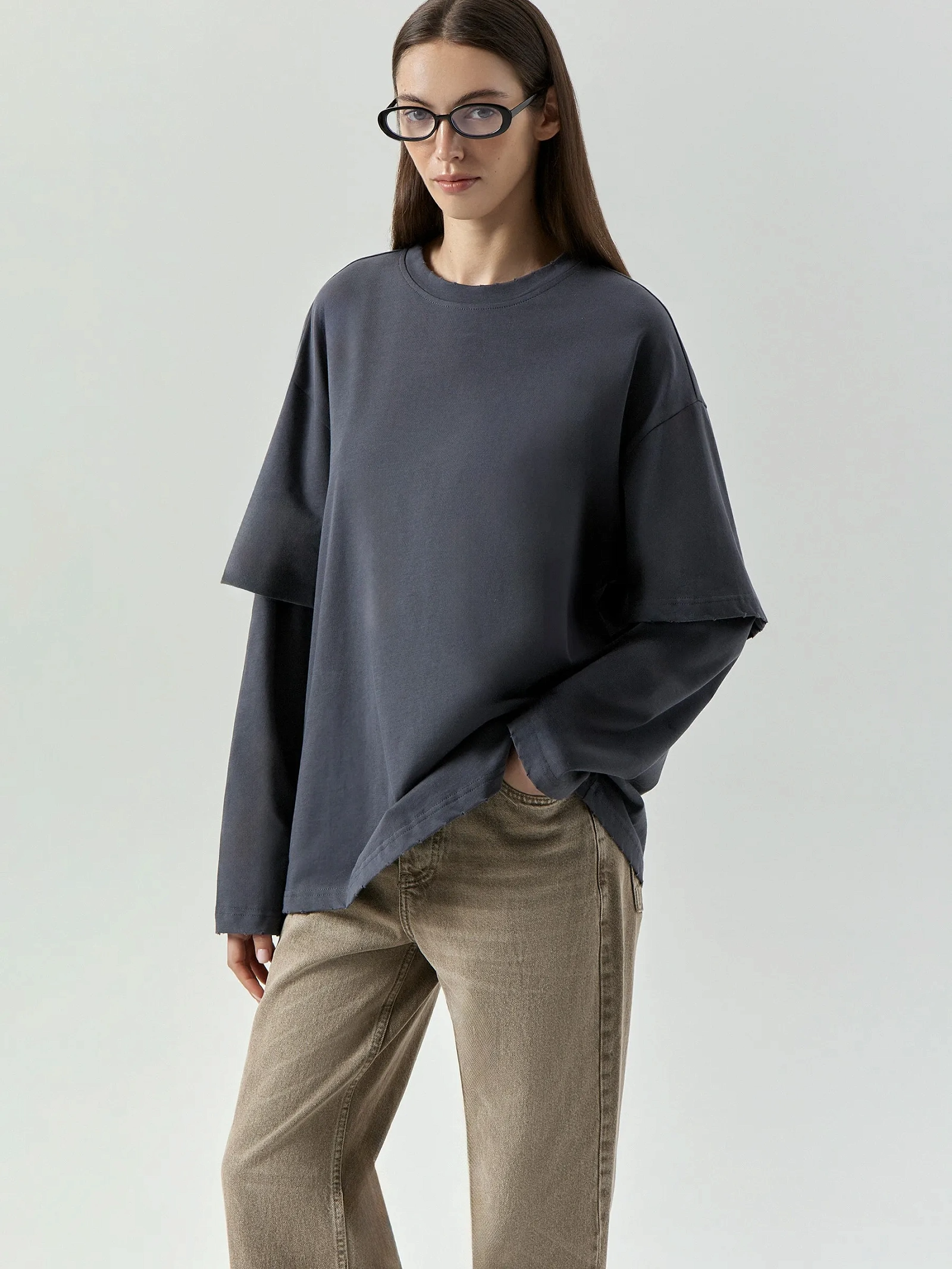 Лонгслив из хлопка в тёмно-сером цвете для модных повседневных образов. Изюминка модели — оригинальная конструкция рукава и рваный эффект. Лонгслив идеален для образов с трендовым денимом и расслабленными брюками.