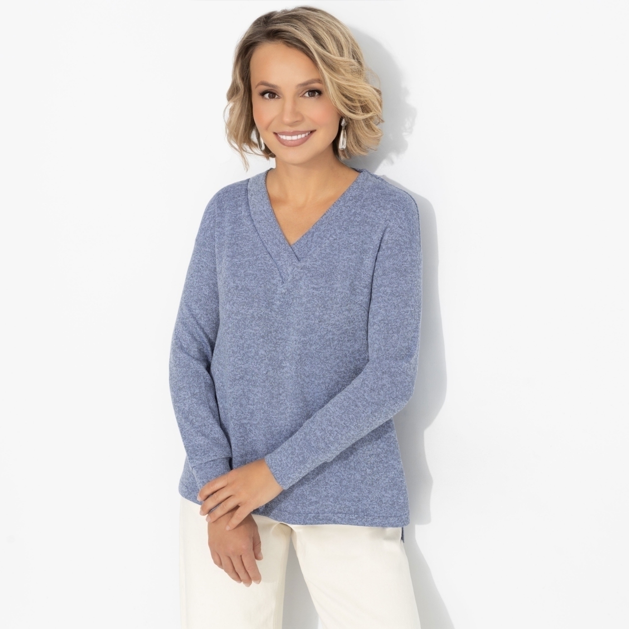 Свободный свитер с V-образной горловиной из меланжевой пряжи не сковывает движения и легко сочетается с базовым гардеробом. Идеально подходит обладательницам голубых, серых, зелёных глаз.
