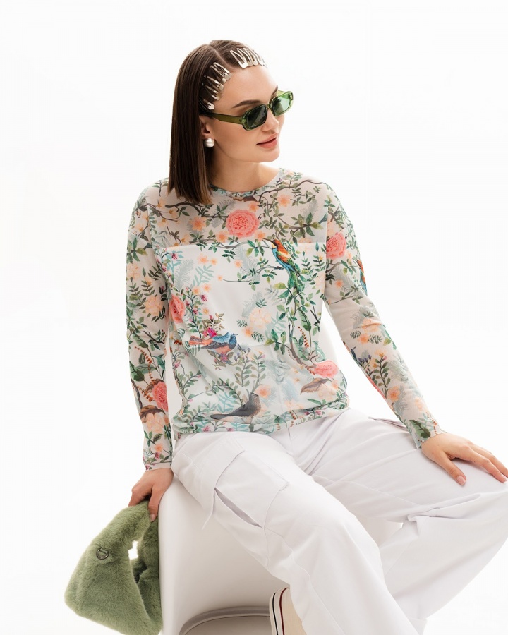Сеточка с принтом «Цветы» придаёт ему уникальный и изысканный вид, а тонкая кофточка нежно струится по телу, создавая кокетливый силуэт. Блузка с атласной вставкой добавляет нотку элегантности и шиковости, делая этот лонгслив особенно привлекательным для вечернего выхода.