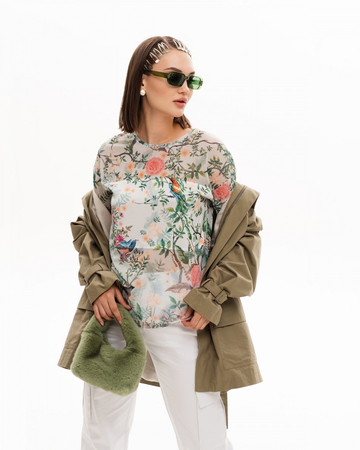 Свободный крой позволяет активно двигаться. Обратите внимание, края изделия не обрабатываются швами, чтобы сохранить эффект полупрозрачности, тонкости и нежности лонгслива. Удлинённый рукав добавляет загадочность образу. Вставка на груди, декорированная авторским принтом, становится акцентом, притягивающим взгляды и вызывающим восхищение.
