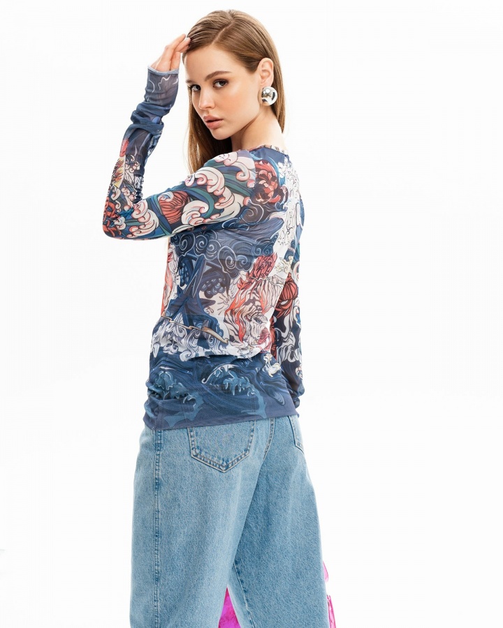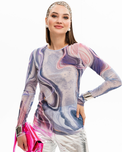 Лонгслив женский из сетки с принтом-тренд Весна-Лето 2024.  Его можно надевать под платье, жакет, кардиган, жилет или даже футболку.