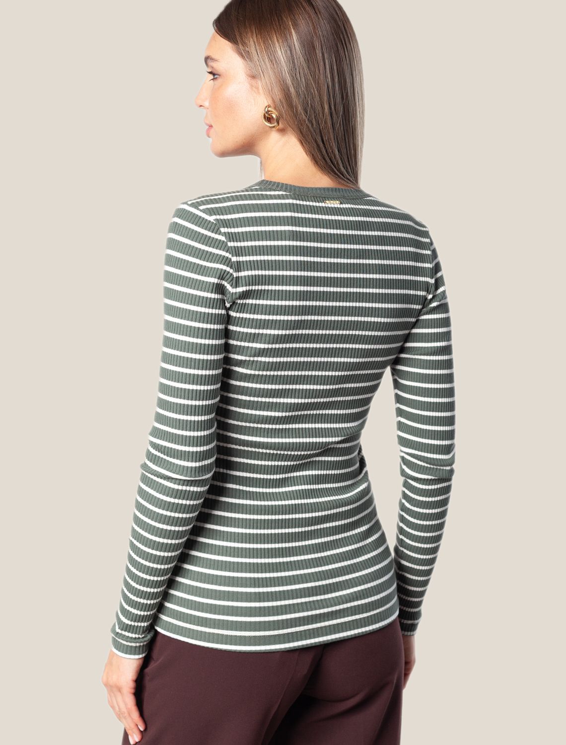 Лонгслив с узким рукавом выполнен из трикотажа в широкий рубчик. Мягкий и эластичный трикотаж безупречно держит форму и комфортно сидит по фигуре, не сковывая движения. Модель дополнена металлическим логотипом бренда.