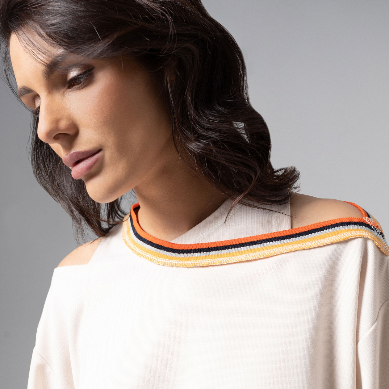 Лонгслив ЧАРУТТИ как игра контрастов. Нежный молочный оттенок сочетается с резинкой контрастных цветов, создавая эффект мягкого свечения вокруг силуэта. Асимметричная многослойность превращает базовую модель в концептуальный объект. Каждый шов изделия – пример безупречной работы. Изделие 2 в 1. Каждый элемент можно носить и стилизовать по-отдельности.