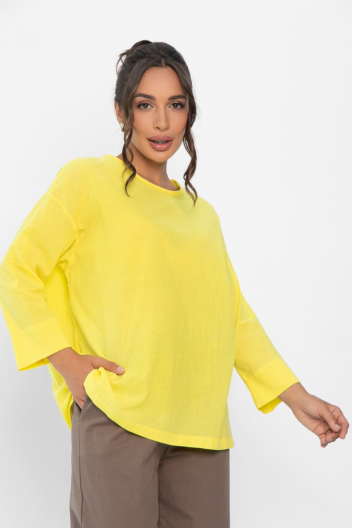 Однотонный лонгслив — это отличный выбор для тех, кто хочет выглядеть модно и стильно. Благодаря округлой горловине и рукавам длиной 3/4 с широким подгибом, этот лонгслив выглядит особенно привлекательно и удобно. Благодаря своему универсальному дизайну, этот лонгслив легко сочетается с различными предметами гардероба и аксессуарами, позволяя создавать разнообразные стильные образы.