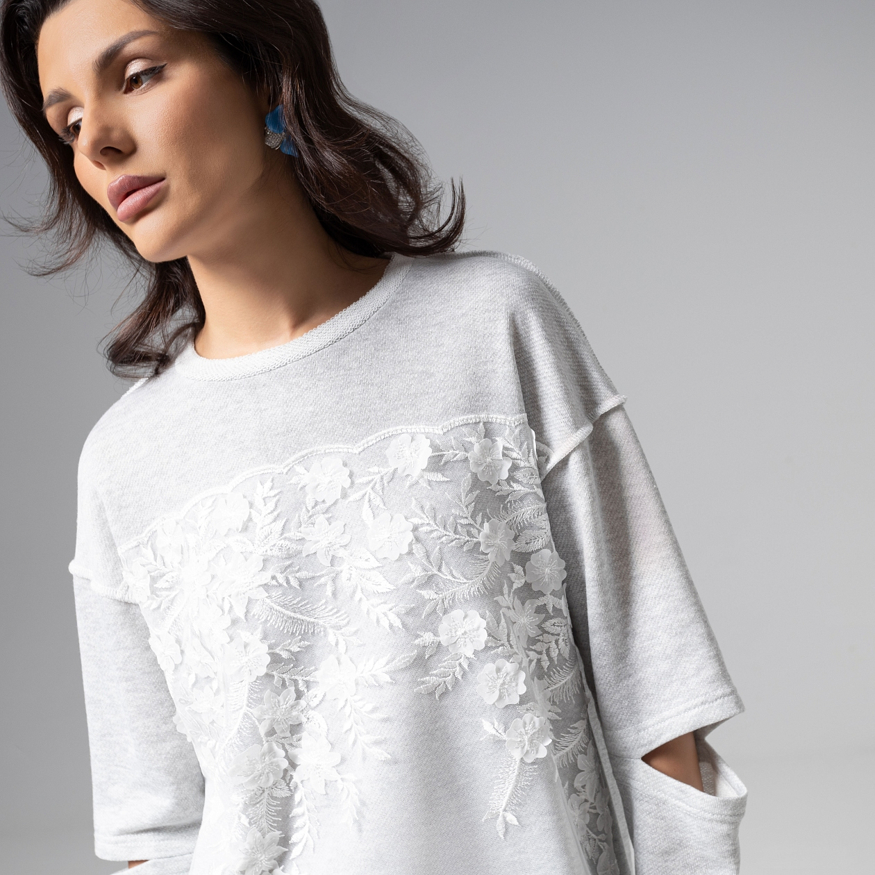 Состав: Трикотаж «футер», вышивка на сетке (50% хлопок, 45% п/э, 5% спандекс)