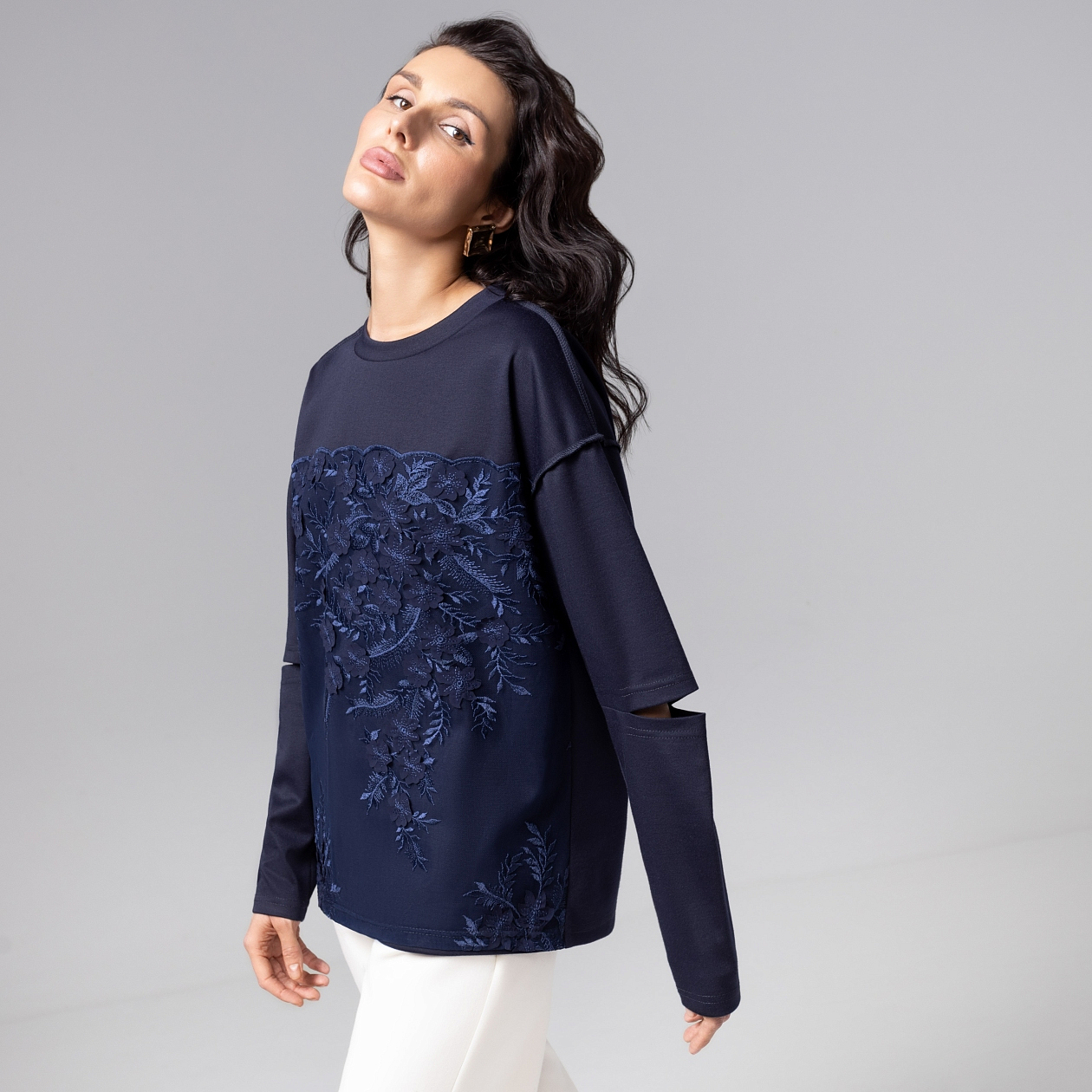 Лонгслив ЧАРУТТИ в дорогом глубоком синем цвете представляет собой баланс стиля casual и haute couture. Свободная посадка подходит любому типу фигуры. Изящное кружевное дополнение по передней стороне изделия придает изделию элегантный вид, а трендовые прорези на рукавах подчеркивают ваше внимание к деталям. Безупречный пошив демонстрируют идеальные строчки и тщательная проработка швов, что гарантирует долговечность носки.
