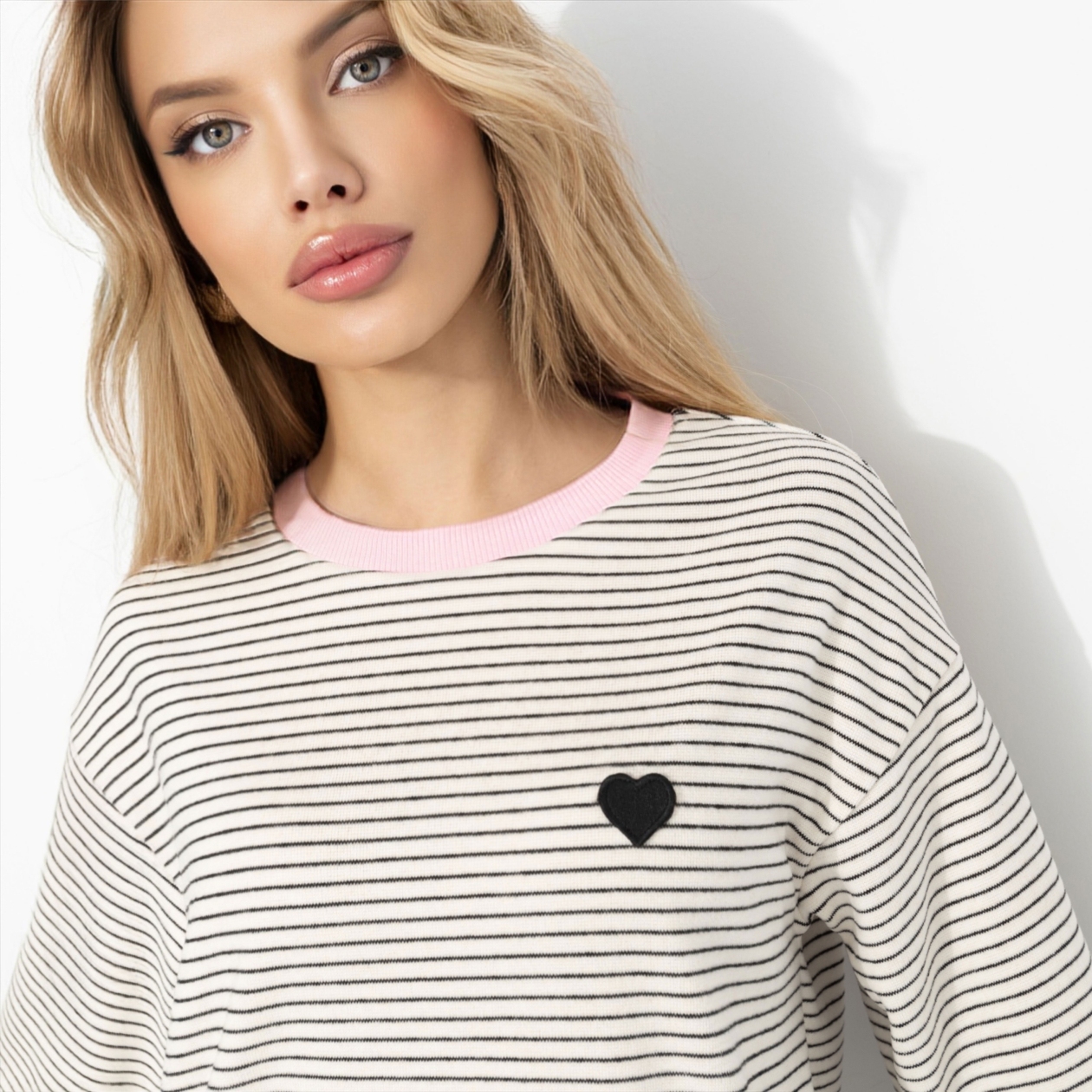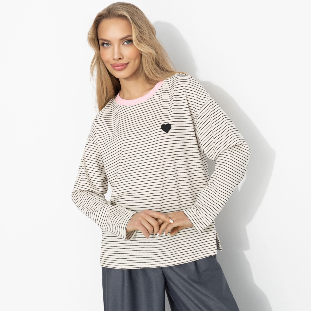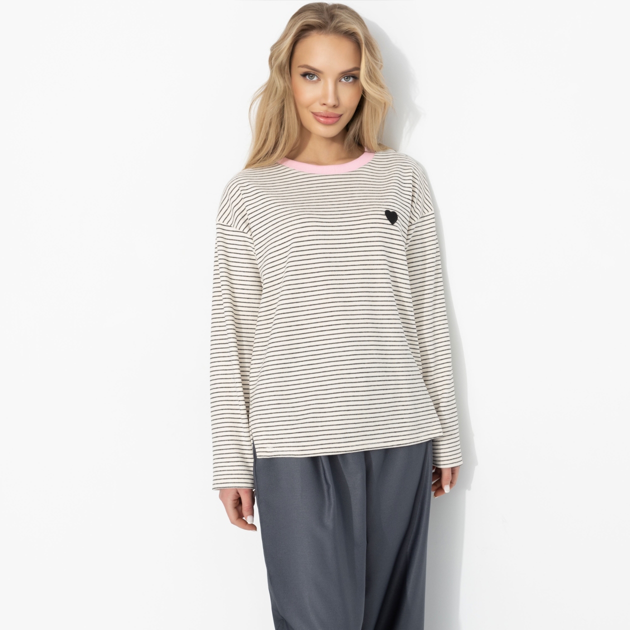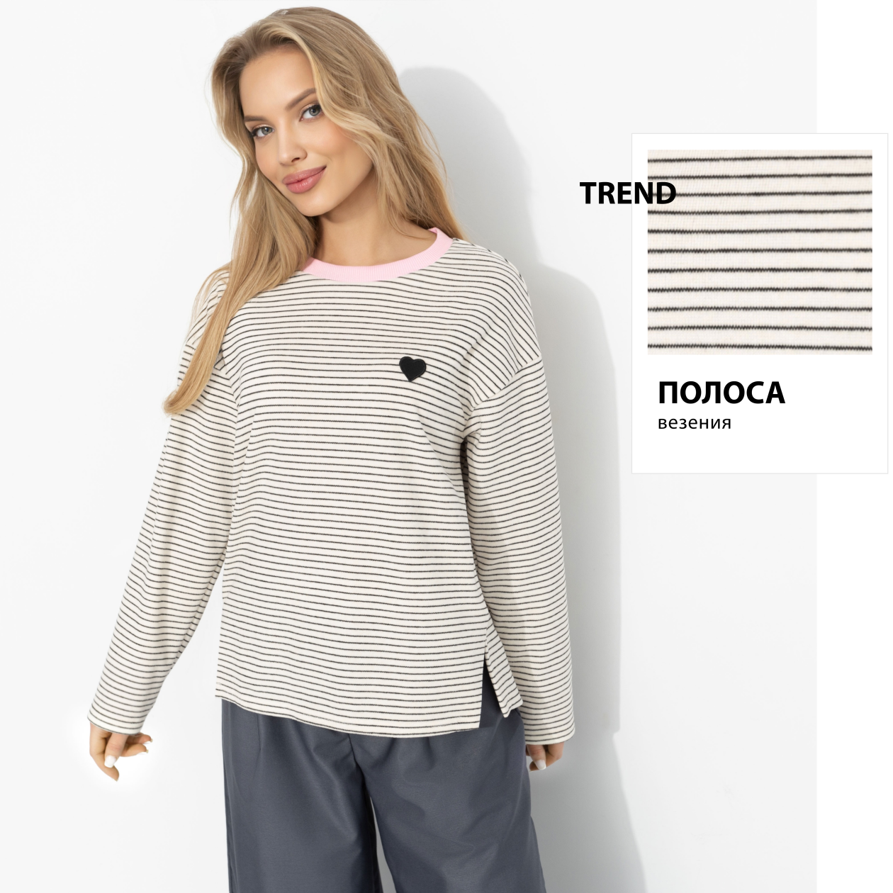 Настроение Comme des Garçons в ЧАРУТТИ – та самая ироничная простота с сердцем на груди. Полоска задаёт ритм, маленький акцент в виде сердца добавляет характер, а мягкий трикотаж с ворсом создаёт ощущение уюта без инфантильности. Вискоза дарит пластичность, эластан – комфорт в движении. Это эстетика момента: немного парижского настроения и много личного стиля.