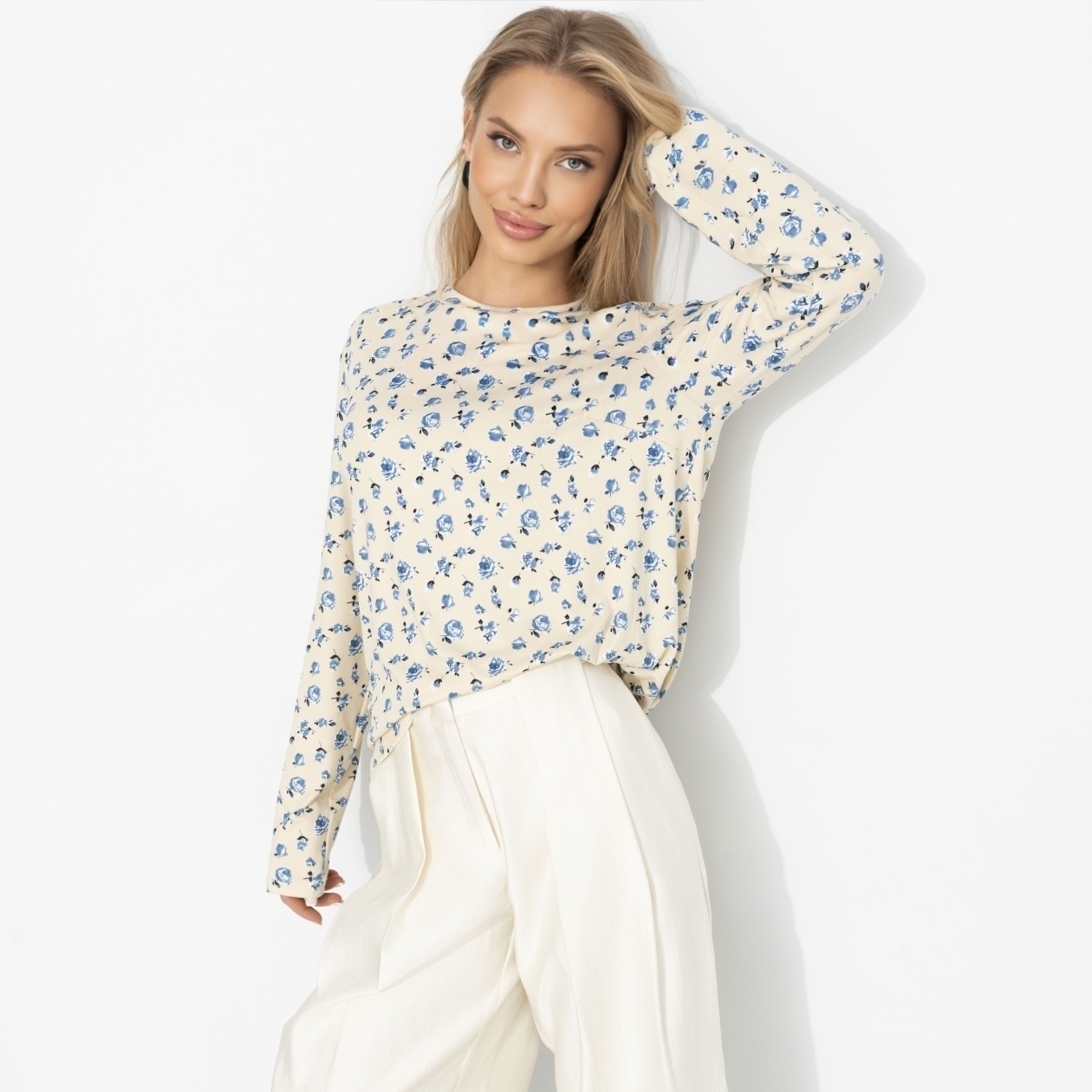 Тренд сезона – new romantic minimal: лёгкость, чистые оттенки и деликатные принты, которые создают настроение без перегруза. Этот лонгслив попадает точно в волну, которую показывали в своих коллекциях Chloé и Zimmermann. Нежный цветочный рисунок звучит свежо, тонкий трикотаж мягко облегает, вискоза дарит пластичность, эластан – комфорт. Вау-эффект здесь не в громкости, а в том, как тонко работает красота.