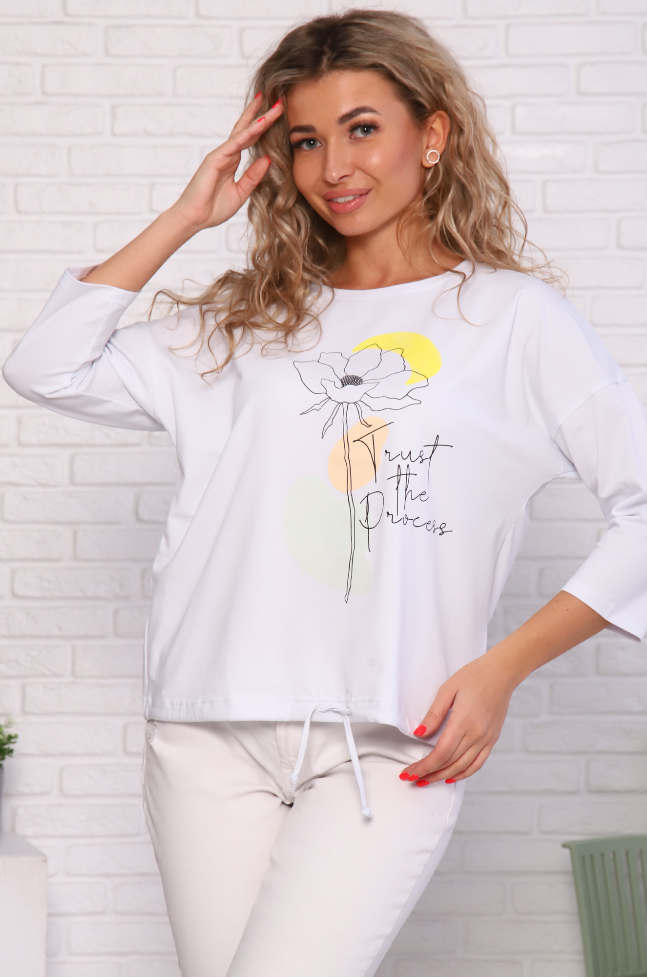 Стильный женский лонгслив - это удобная модель на прохладную погоду. Модель прямого свободного кроя, снизу на кулиске, рукав 3/4. На полочке печатный принт. Ткань плотная, мягкая, шелковистая, эластичная и приятная к телу кулирка с добавлением лайкры в качестве пенье.