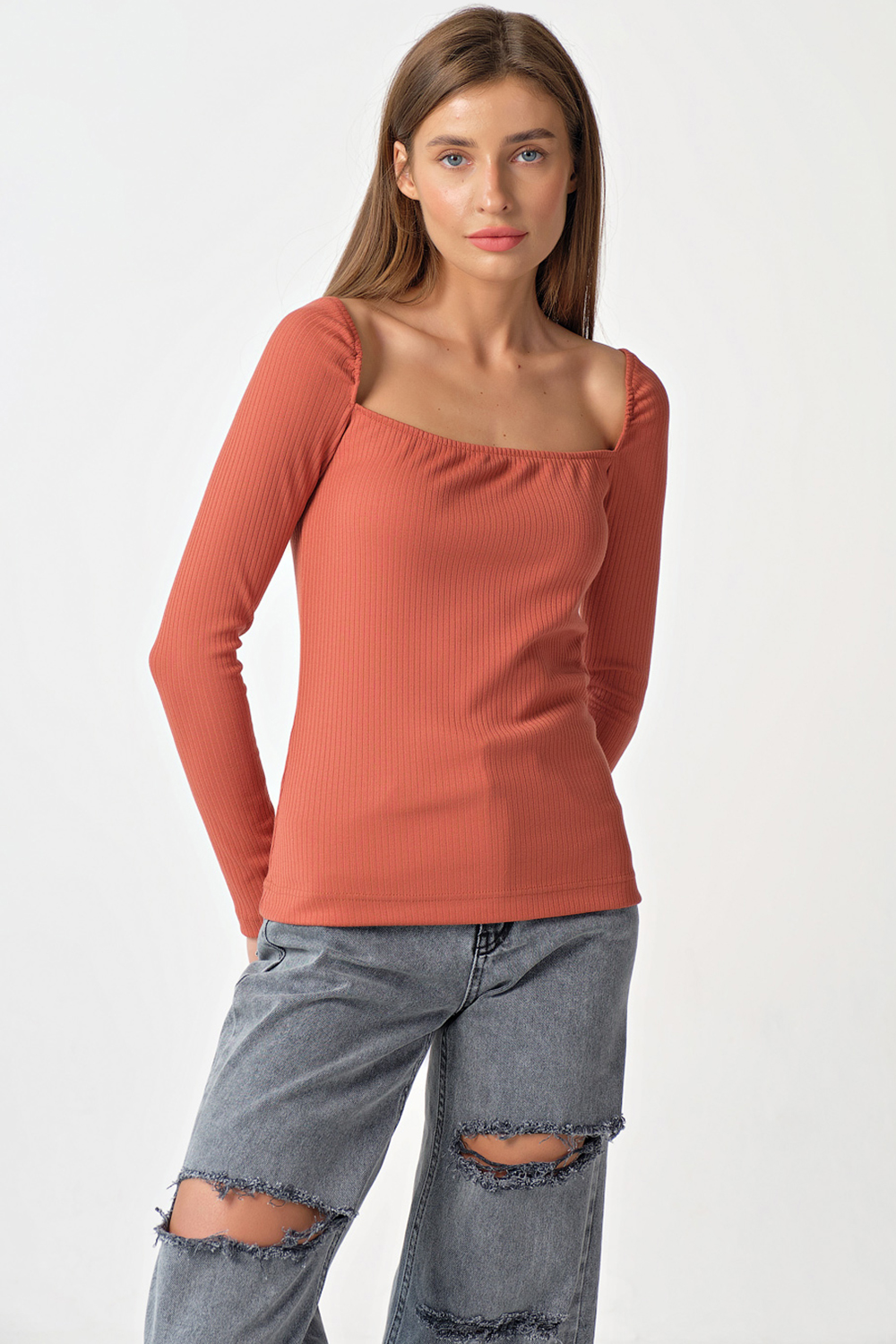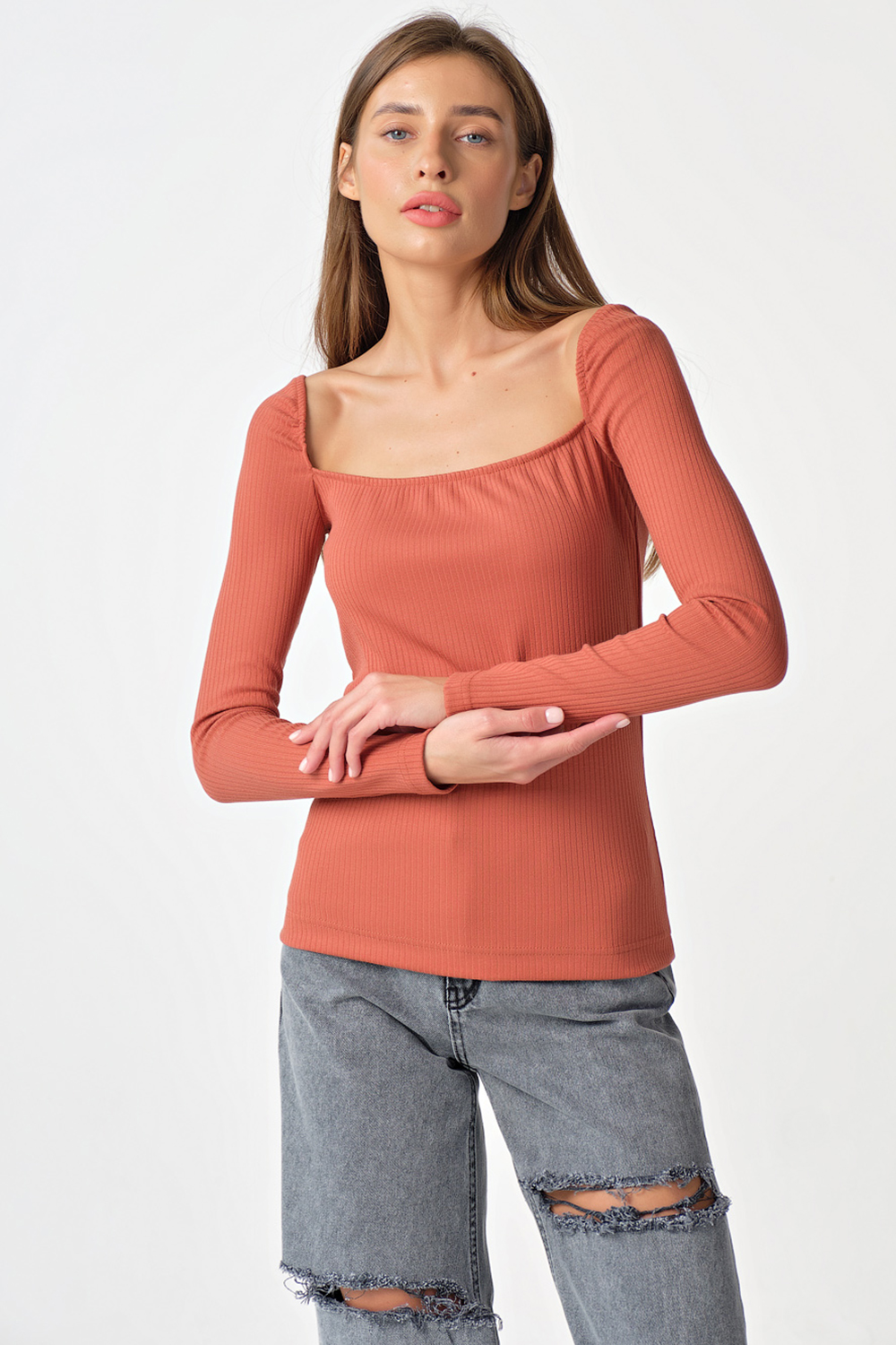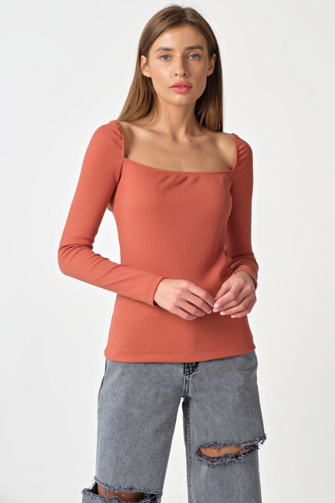 ст. цена1837руб.! Лонгслив трикотажный с квадратным вырезом терракотовый