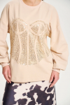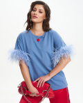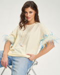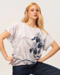 Лонгслив молочного цвета. Облегающая модель из мягкого и приятного трикотажа подчеркивает женственность и нежность образа. Мелкий голубой цветочек придает изделию свежесть и легкость, делая его идеальным выбором для повседневного стиля.