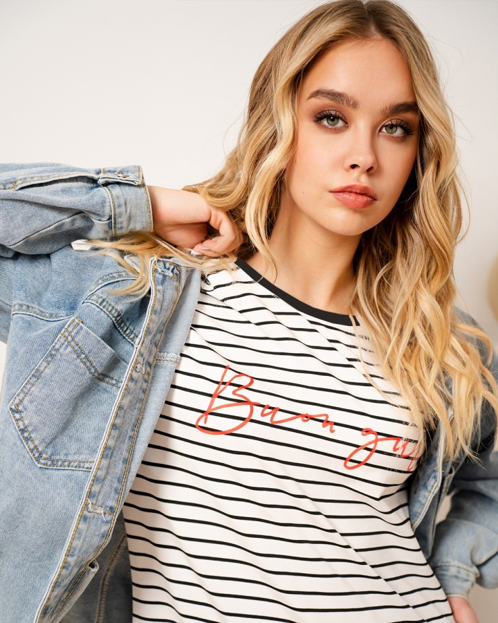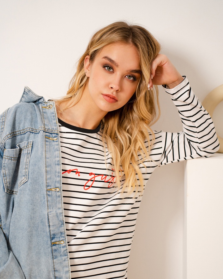 1200р1480р Лонгслив в полоску с надписью 70.7.3