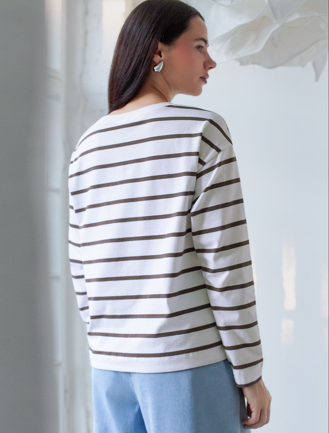 Свободный лонгслив белого цвета в кофейную полоску с длинным рукавом выполнен из премиального хлопка с добавлением эластана, плотностью 170 Г/м2, что обеспечивает комфорт и приятные тактильные ощущения. Полоска - придает изделию легкую текстурность, принт в виде листиков, который нанесен красками с устойчивым покрытием, добавляет стиля и индивидуальности, а круглый ворот создает универсальный образ, который подойдет для повседневного использования. Такой лонгслив идеально подходит для весеннего и летнего сезона благодаря легкой и дышащей ткани. Представленная широкая размерная линейка позволяет выбрать оптимальный вариант на любую фигуру, в том числе на плюс-сайз, обеспечивая свободу движений и удобство на каждый день. Этот комфортный лонгслив станет отличной базой в гардеробе, сочетаясь с различными стилями одежды и создавая простой, но эффектный образ.