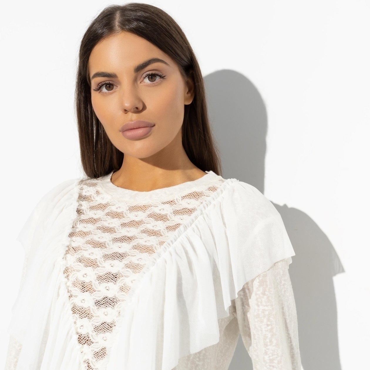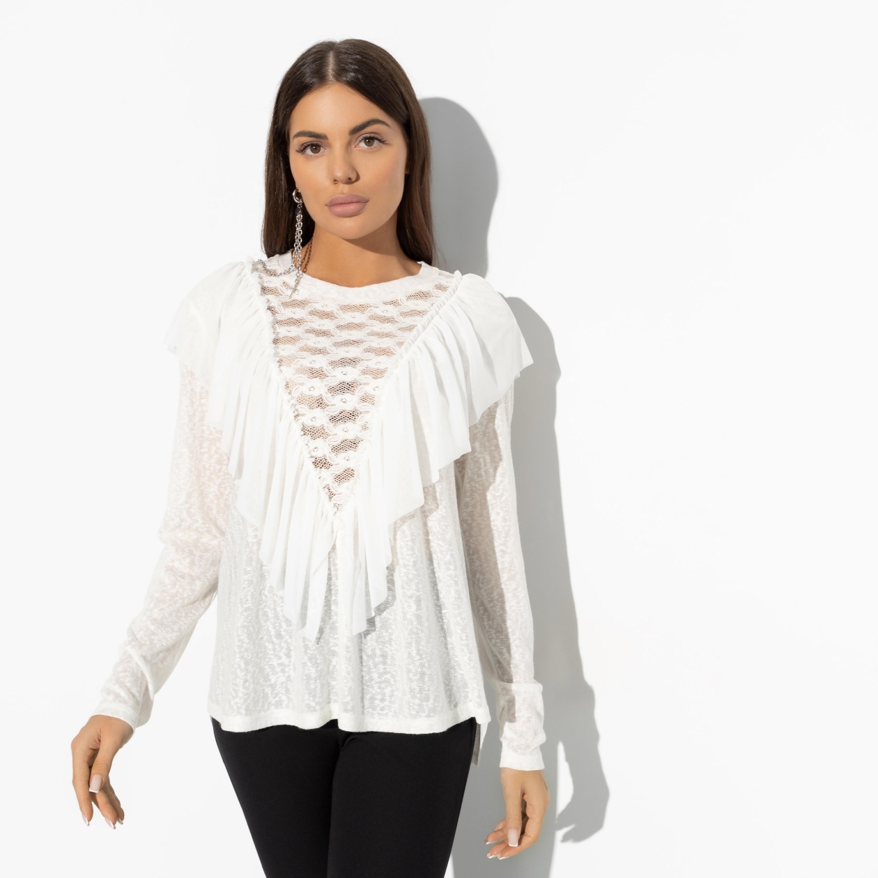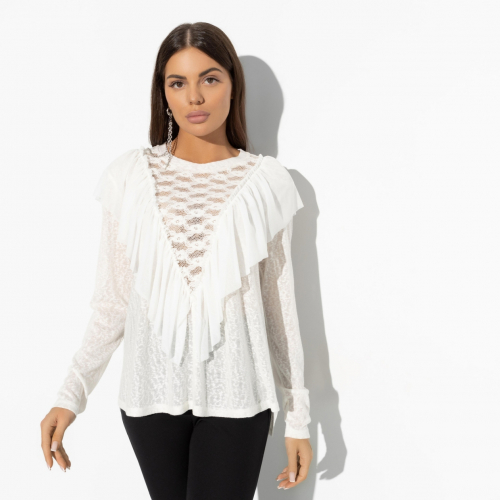Сто комплиментов помножим на три предложения о встрече. Такова арифметика уникального лонгслива CHARUTTI. Посчитать выгоду от обладания изделием сможет даже отъявленный гуманитарий. Сложите прозрачность, рюши и кружево, чтобы получить правильный стильный ответ. Лонгслив свободного кроя. Рукав чуть удлинен. Изделие с двух сторон украшено рюшами. Лонгслив слегка прозрачный.