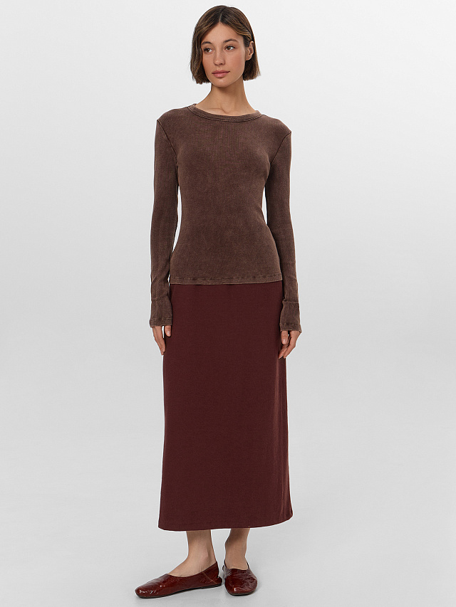 Лонгслив легко комбинируется с деловыми брюками, джинсами или юбками, органично вписываясь в офисный гардероб и образы для отдыха. Сдержанный коричневый оттенок с эффектом acid wash добавляет лонгсливу стильную глубину, а качество материалов гарантирует комфорт в течение всего дня.