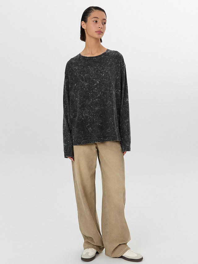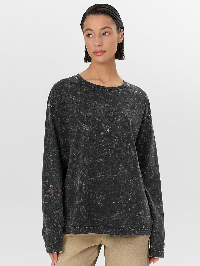 Лонгслив женский с длинным рукавом серого оттенка — идеальное решение для создания стильных повседневных образов. Модель выполнена из мягкого хлопка, обеспечивающего комфорт и воздухопроницаемость. Особенность изделия — уникальная обработка поверхности с эффектом мягких размытых разводов, создающая неповторимый винтажный вид. Эта техника состаривания ткани придает каждому лонгсливу индивидуальный характер — рисунок никогда не повторяется, делая вашу вещь эксклюзивной.