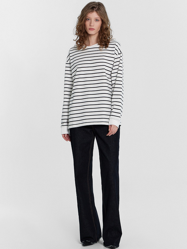 Полосатый лонгслив женский из высококачественного хлопка, свободного силуэта. Вырез круглый, рукава длинные на манжетах. Спущенная линия плеча и углубленные проймы дарят свободу движений. Отличный вариант для создания интересных образов. Тельняшка – это тренд уже несколько лет. За счет хорошей плотности материала, эта модель не просвечивает, а швы не натирают кожу. Лонгслив женский с длинным рукавом очень удобный и комфортный, с ним легко можно составить массу интересных аутфитов для городских будней. Если вам надоели привычные базовые свитшоты, этот базовый лонгслив — отличное решение! Дополнить джемпер женский оверсайз из хлопка можно стильным низом из линейки базовой одежды для женщин. Широкий размерный ряд и красивые расцветки, есть модели для девушек plus-size. Рекомендуем!
