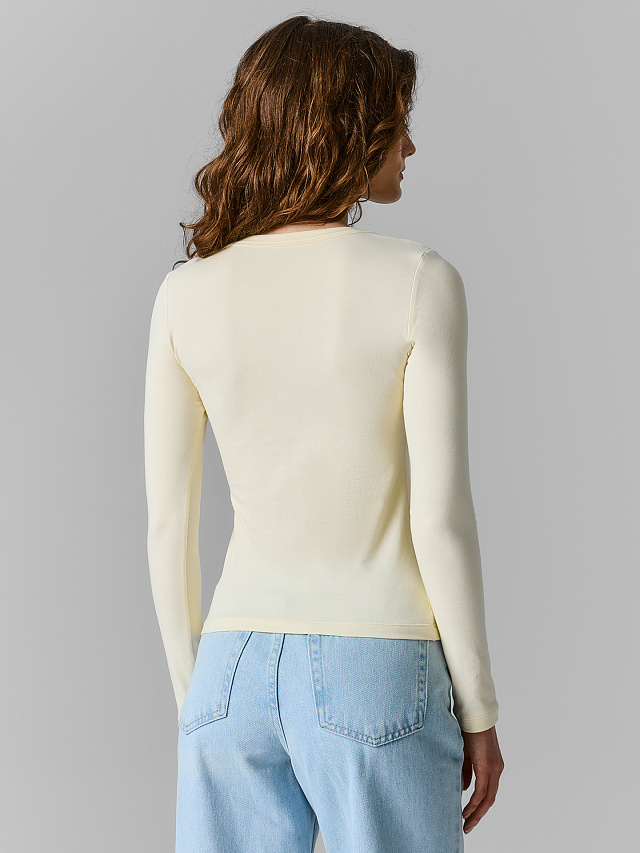 Лонгслив в нежном жёлтом оттенке — удобная основа для повседневных образов. Облегающий силуэт мягко подчёркивает фигуру, глубокая овальная горловина добавляет женственности и визуально вытягивает шею. Длинные рукава делают модель подходящей для любого сезона: в прохладную погоду в ней комфортно, в тёплую — не жарко.