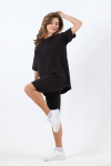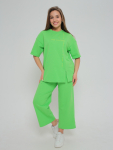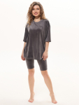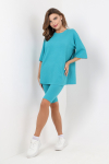 Пижама женская из гладкокрашенного трикотажного вискозного полотна, состоящая из футболки и шорт. Футболка - слегка расширенная книзу, с короткими рукавами покроя «реглан» и горловиной овальной формы. Проймы и горловина окантованы основным материалом. По срезу горловины выполнена небольшая сборка. Нижние срезы рукавов обработаны узкой обметочной строчкой. Шорты – свободного покроя, удлиненные, с эластичной тесьмой по талии.