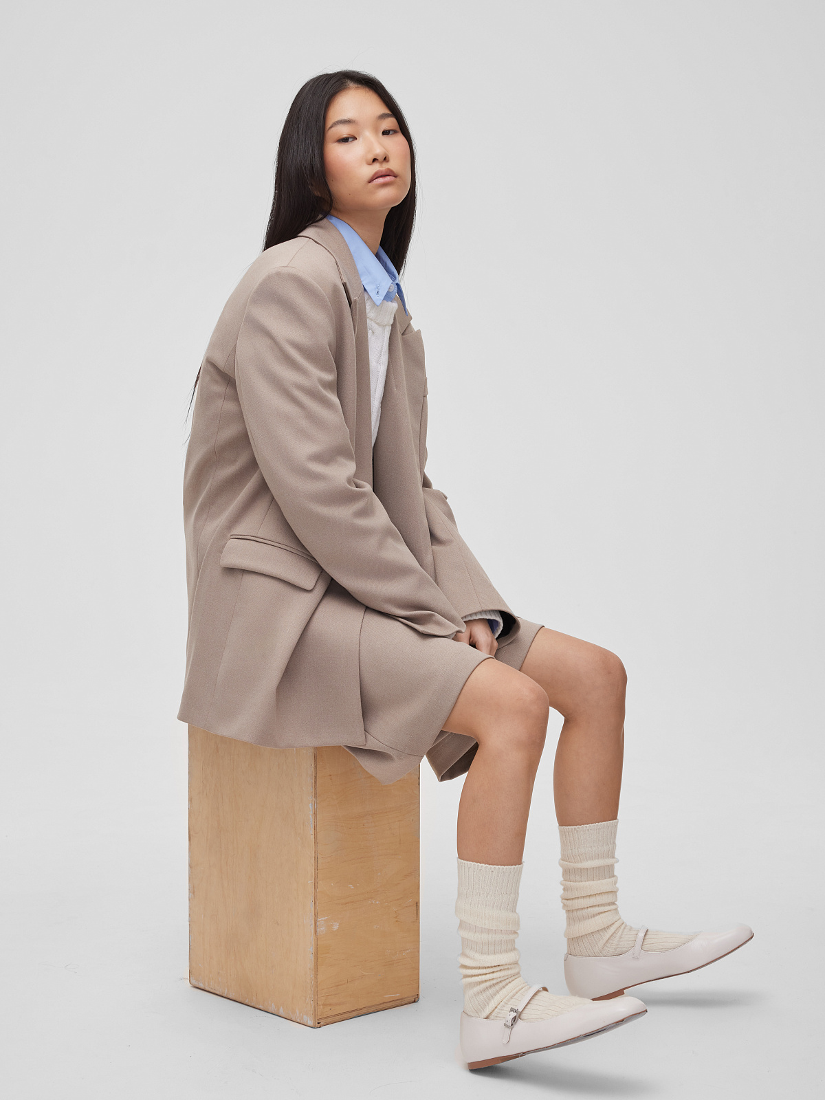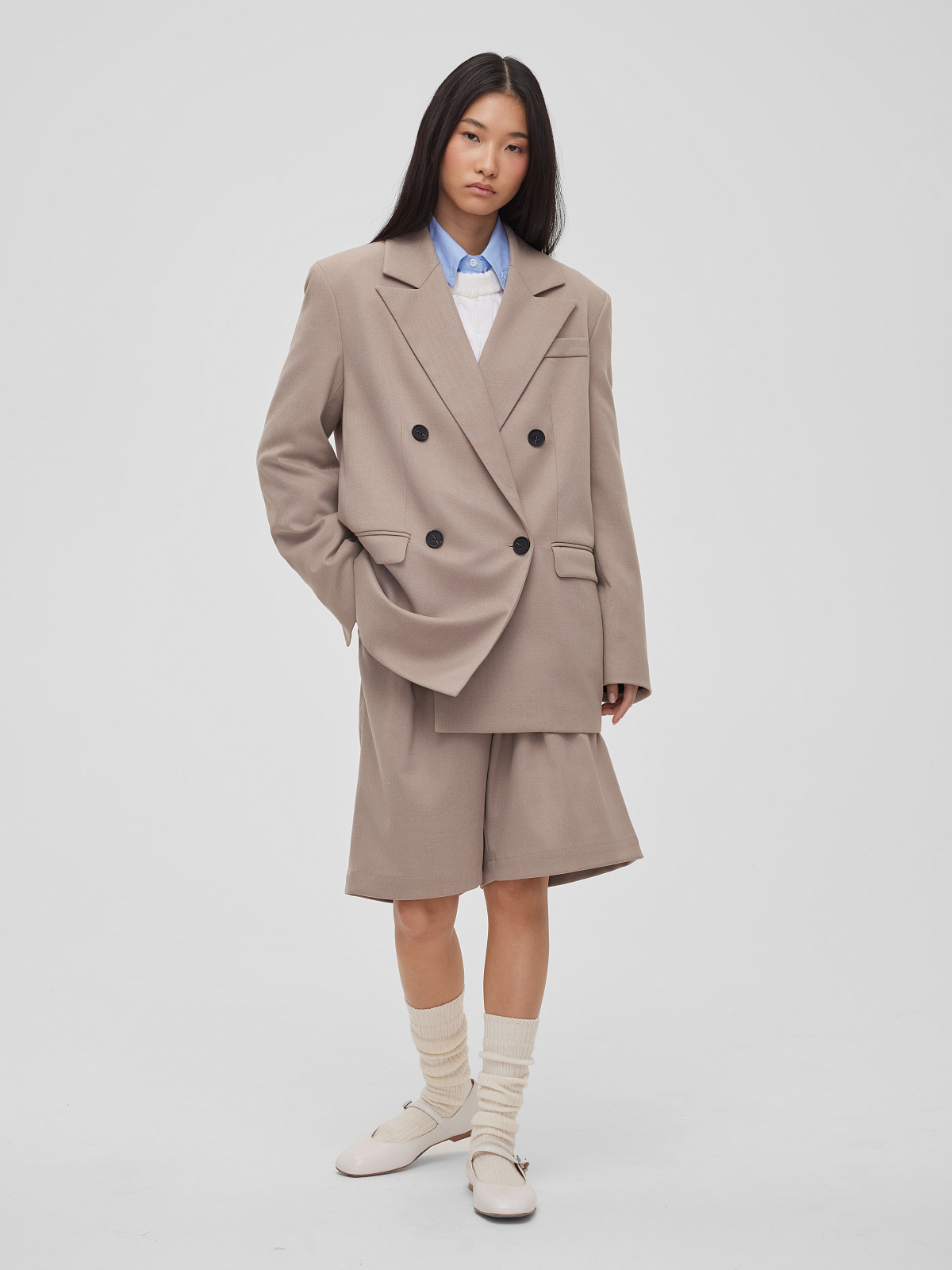 В комплекте с брюками свободного кроя с защипами этот жакет создает гармоничный и современный образ. Такой костюм легко сочетать как с рубашками для официальных мероприятий, так и с футболками и поло для повседневной носки, позволяя вам выглядеть гармонично в любой ситуации.